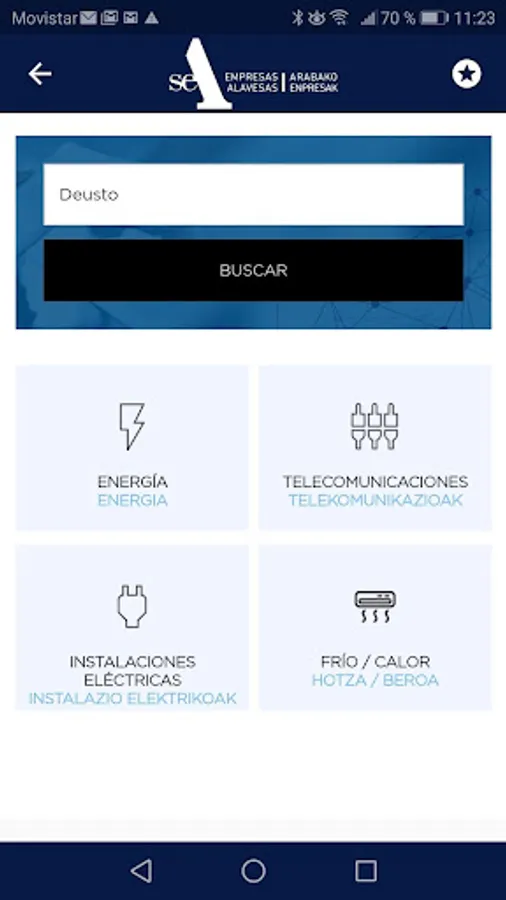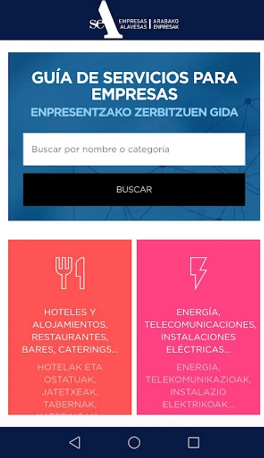 App that collects all the services offered by the different companies associated with the ASOCIACIÓN EMPRESARIAL SEA EMPRESAS ALAVESAS (SEA), and which allows each of them, collected through an orderly directory, to be approached through direct access to their phone, their location and their business website.