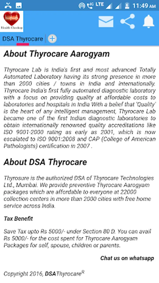 Thyrocare Technology Ltd is an India's first and most advanced Totally Automated Laboratory having its strong presence in more than 2000 cities/towns in India and internationally. Thyrocare India's first fully automated diagnostic laboratory with a focus on providing quality at affordable costs to laboratories and hospitals in India With a belief that 'Quality' is the heart of any intelligent management, Thyrocare Lab became one of the first Indian diagnostic laboratories to obtain internationally renowned quality accreditations like ISO 9001-2000 rating as early as 2001, which is now escalated to ISO 9001:2008 and CAP (College of American Pathologists) certification in 2007 .
