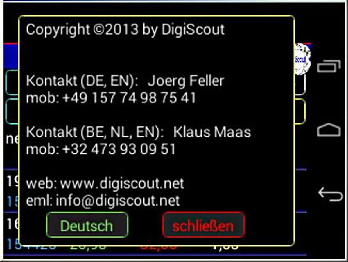 You may select your language (German, English UK, English U.S., or Dutch) by pressing the "Info" button (upper right) and then the language button on the lower left.
