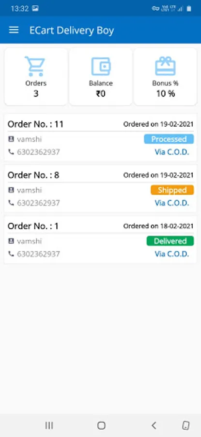 Delivery application is for the delivery boys to deliver the product to customer. Delivery boys will see the list of orders assigned by the admin. They pick up the package and order status is changed to processing. Delivery boys will see the orders list and navigate to customers location. Delivery boy will make the otp verification and deliver the package.