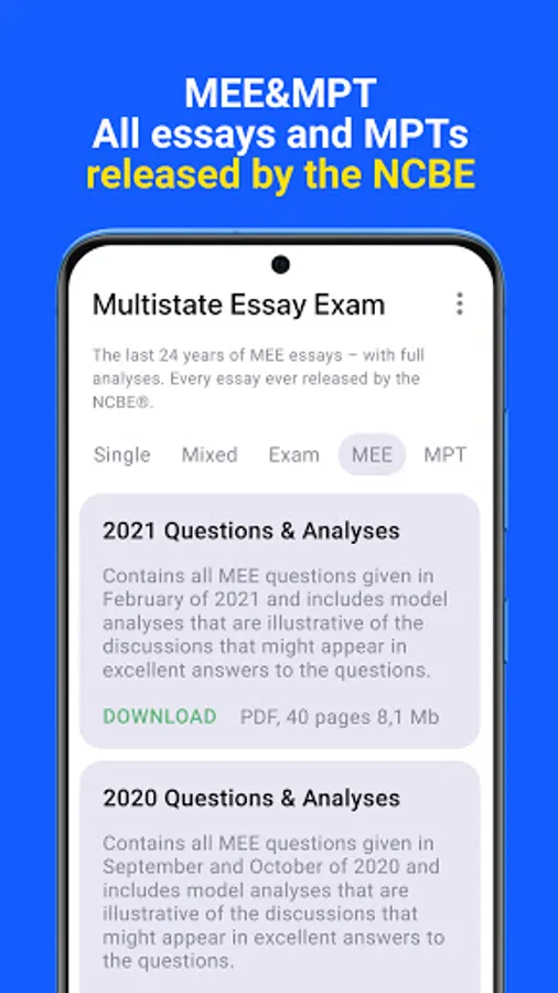 Get your hands on the last 23 years of official MEE essays - with full analyses. Plus, the last 23 years of MPT tests, complete with the legal points, facts, and possible issues within the lawyering tasks described.
