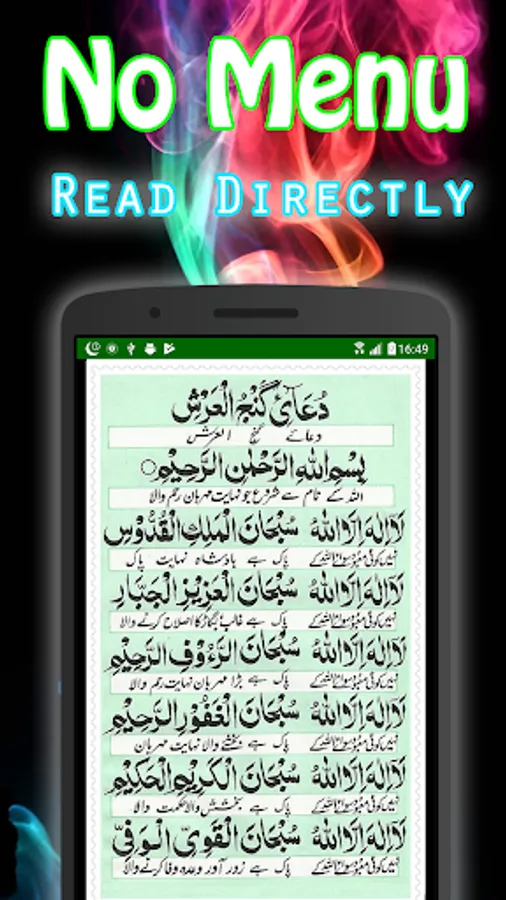 Install this offline Dua e Ganjul Arsh with Urdu Translation if you just want to open and read the Arabic Text without any interruptions. Also included is Urdu Meaning (Tarjuma).