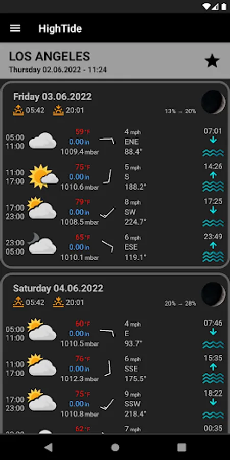- High and low tides times for the next seven days. (six days in UK)