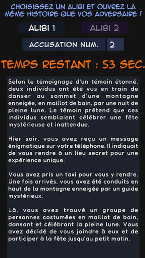 Dans ce jeu, vous avez un alibi a apprendre avec votre partenaire, et devez le restituer aux enquêteurs pour ne pas finir en prison !