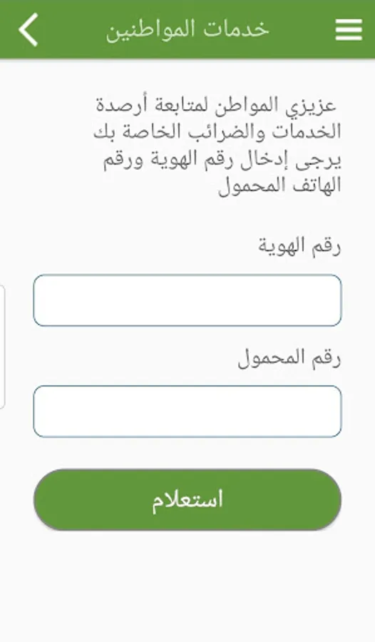 1. The citizen inquires about the balances of the entitlements for his services and the taxes due to him by entering the ID number and the mobile number, so that the process is done quickly and with accurate data.