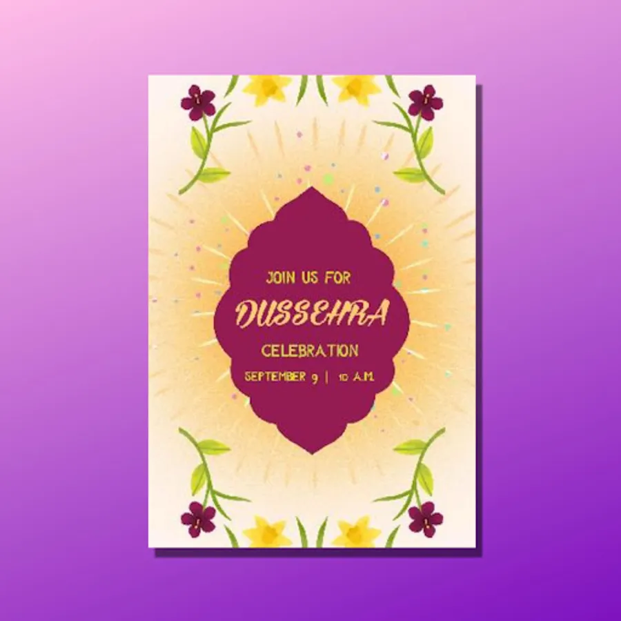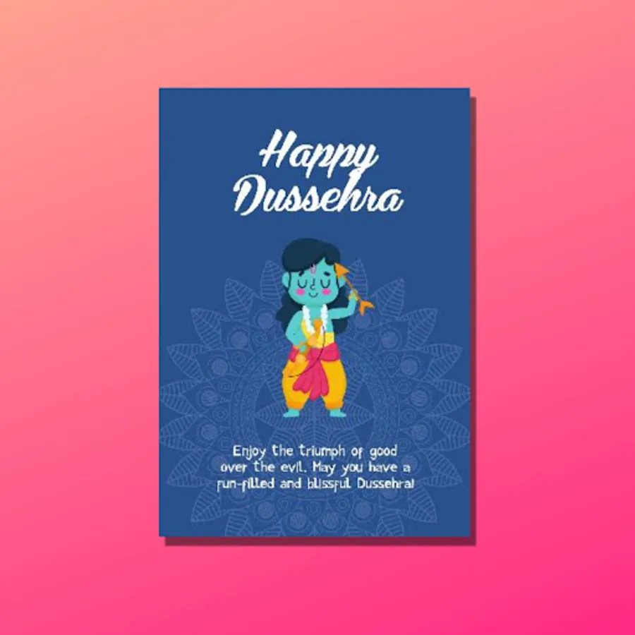 Dussehra Card maker is a free Dussehra greetings and invitation card maker. Dussehra is symbol of victory of Good or evil or bad. Let's celebrate this festival by sharing Dussehra cards with friends and family. On the auspicious occasion of Dussehra people burn an statue of ravana to signify the victory of Lord Ram over Evil Ravana. Dussehra is the tenth and final day of the Hindu festival of Navaratri, usually in October. In southern India it especially commemorates the victory of the god Rama over the demon king Ravana. It is known as Vijayadashmi as well.