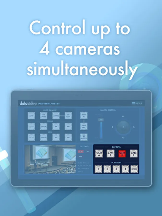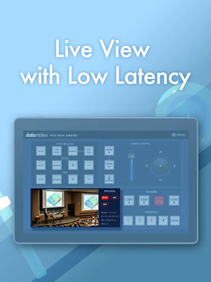 The camera control app is tailored for the Datavideo PTZ camera series. It can monitor the live streaming video from PTC-140, PTC-280, and PTC-300 series. The app can control up to 4 cameras simultaneously via DVIP, you can intuitively set up and recall the presets, and adjust white balance, focus, and Iris. The app can decode the live streaming via RTSP (SRT and NDI steaming coming soon), easily to monitor the live streaming video and set up the parameters promptly in one application.