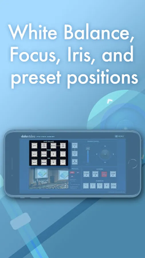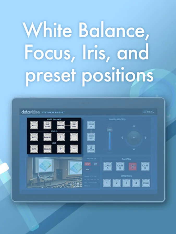 With the multi-touch interface, you can not only pan, tilt and zoom with variable speed for a nice camera control experience, but you can also control White Balance, Focus, Iris, and preset positions.