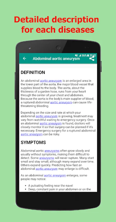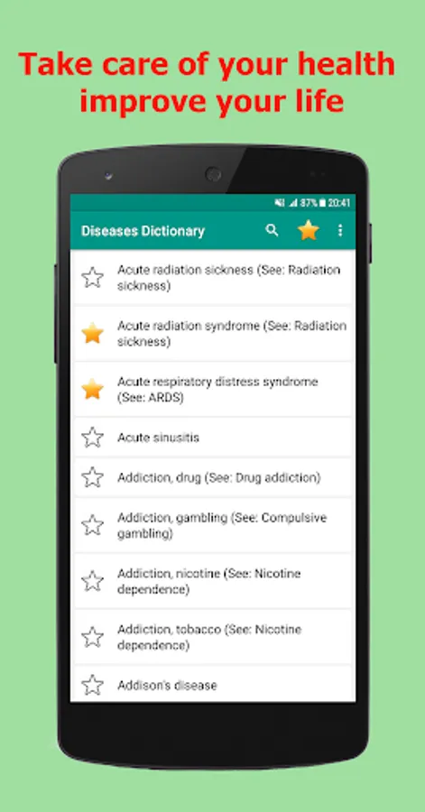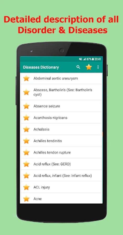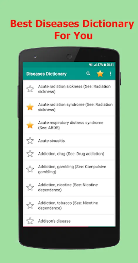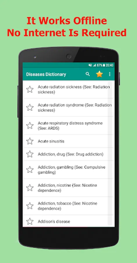 Diseases Dictionary Offline is complete OFFLINE and FREE app containing list of Medical disorders & diseases that provides all information about symptoms, disorder and treatment and many medical terminology.