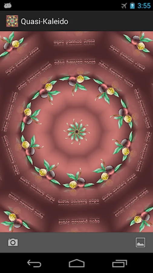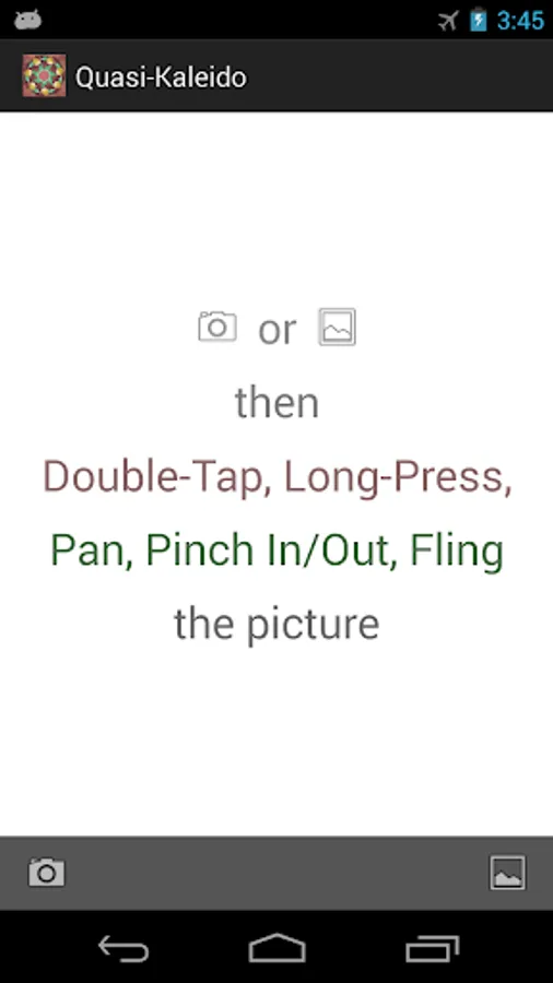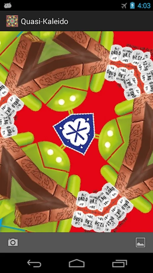 With the App you can take a picture (eg photo yourself ^ __ ^) or select a picture in your phone. Then the App will demonstrate fantastic kaleido effects on the picture. Also yo can long-press, double-tap, scroll, fling or zoom (pinch in / out) the picture to see what happens.