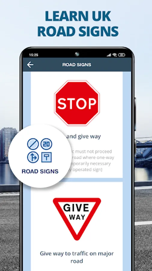 ⛔️ Road Signs: Learn over 150 UK traffic signs and light signals using illustrations and descriptions. Test your road signs knowledge later on using the theory tests.