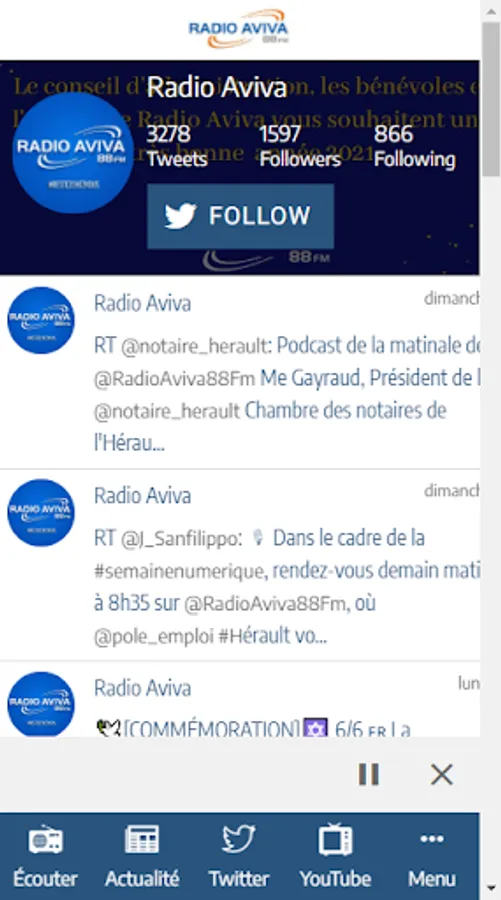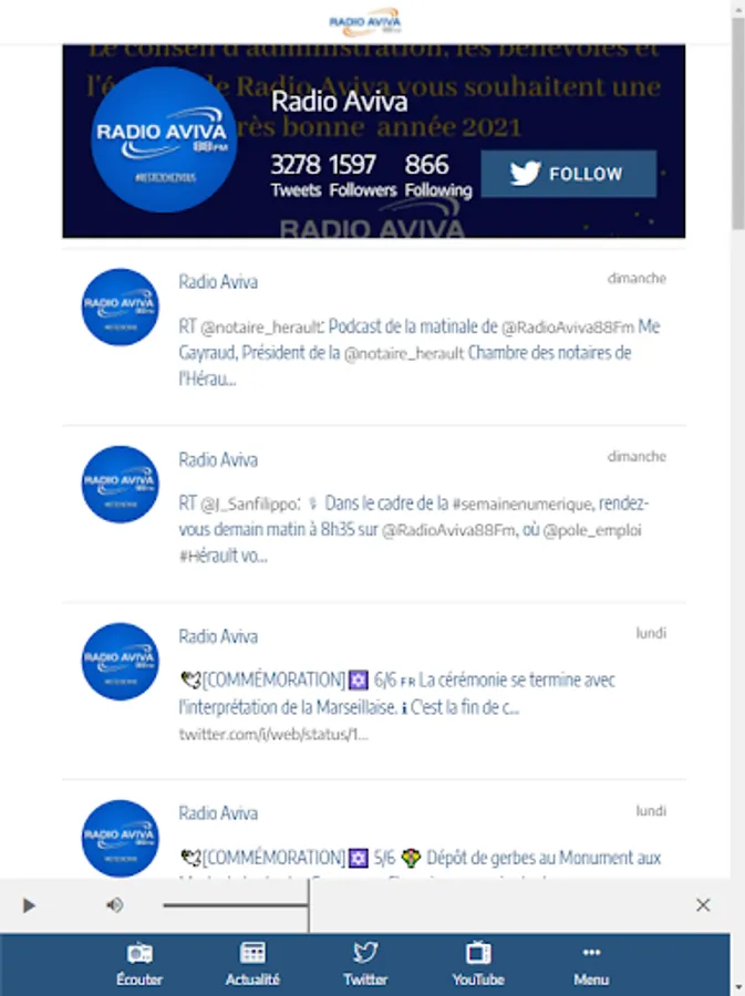 Thanks to this application, you can listen to Radio Aviva live, follow the news of the radio, re-listen to our programs in podcasts, know the title currently being broadcast, discover our program schedule, contact us etc...