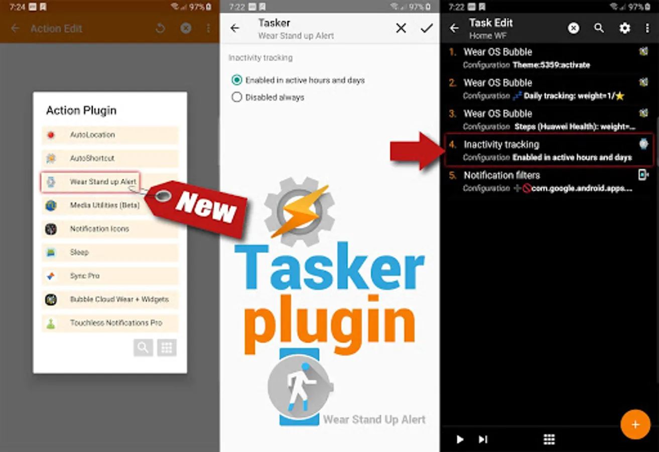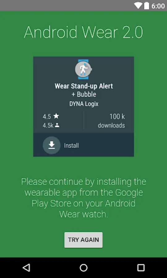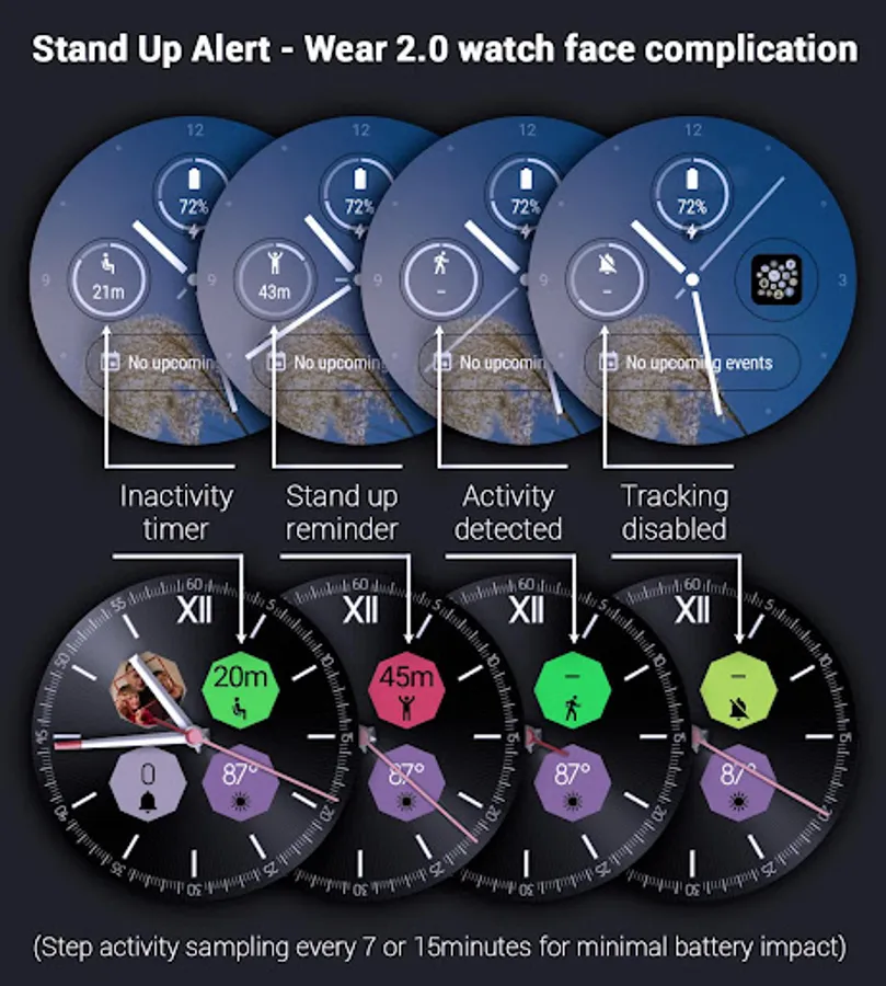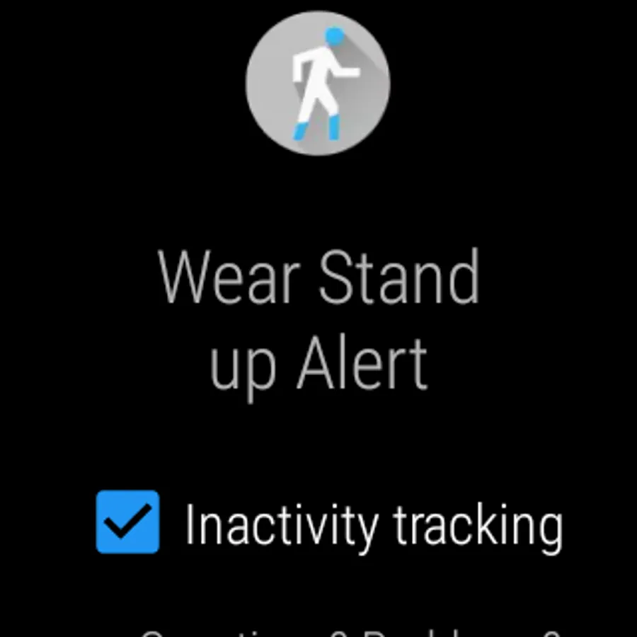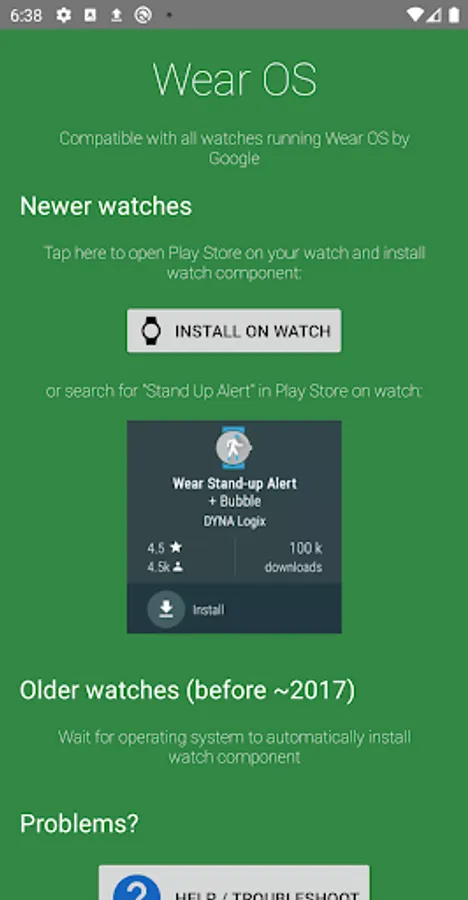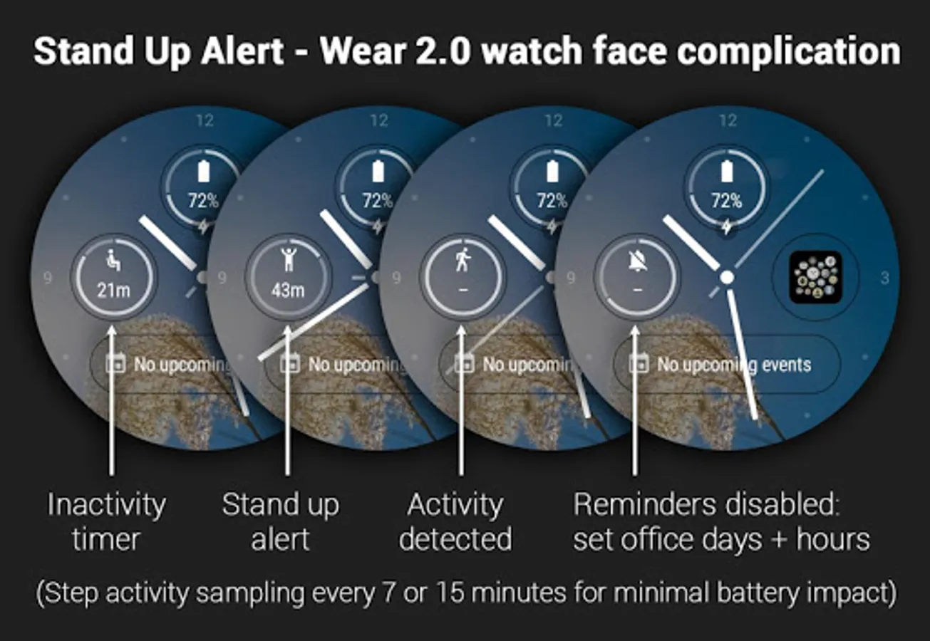 Adds the Wear Stand-up Alert app on your Wear OS watch: it works without additional download. Configuration on the watch: