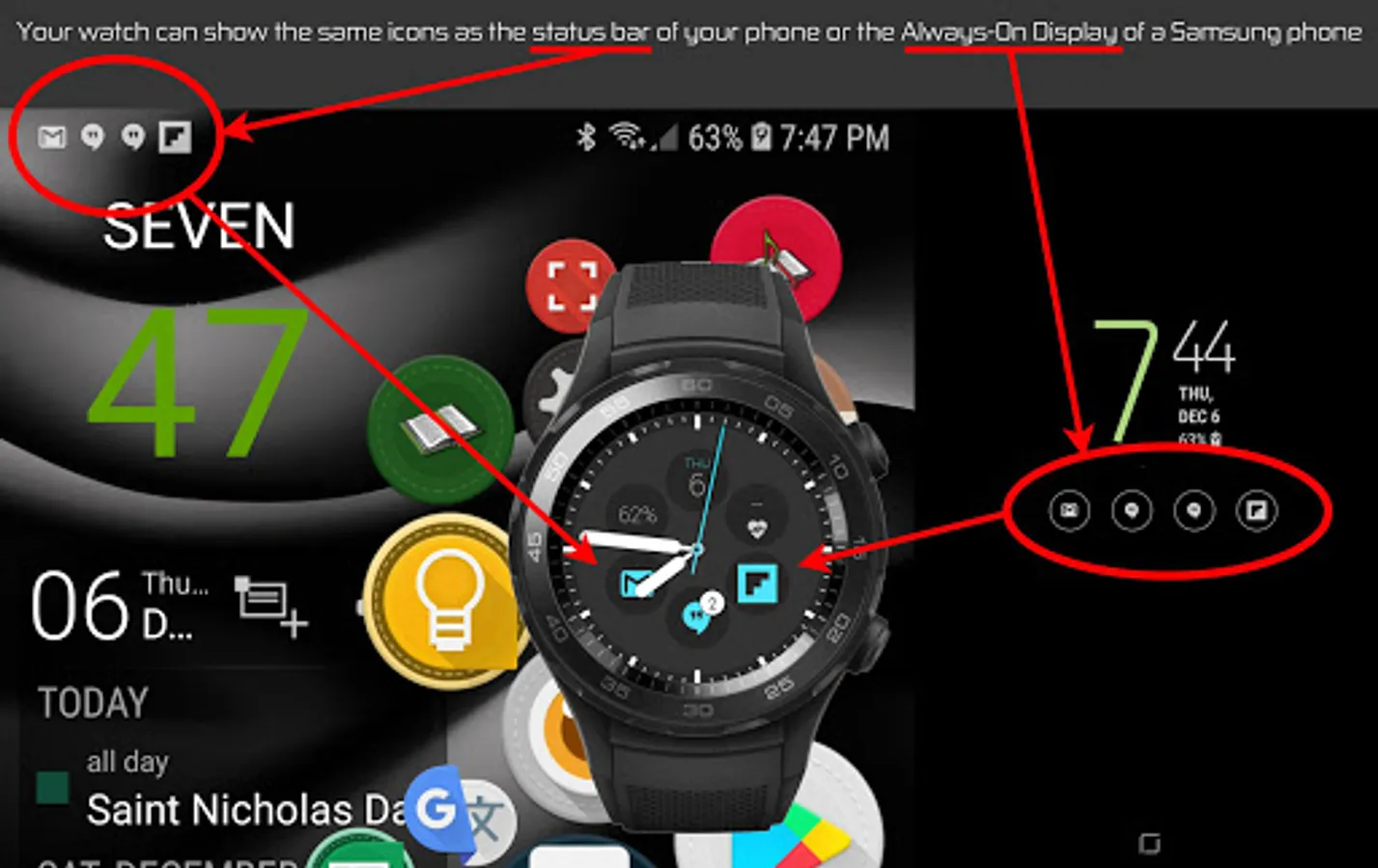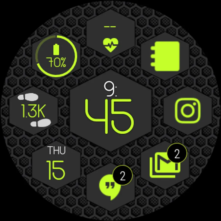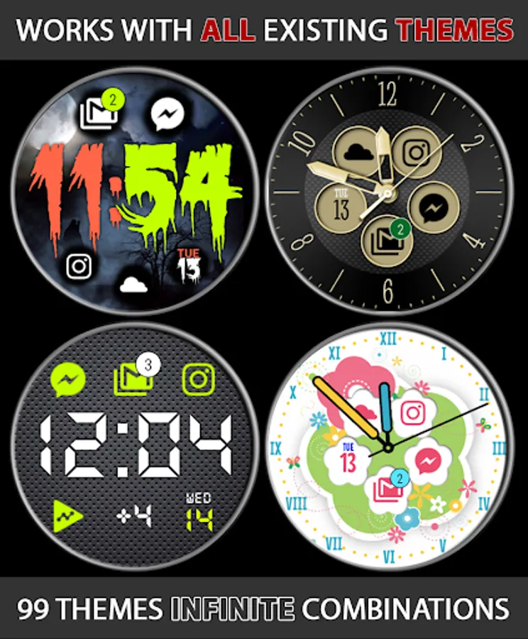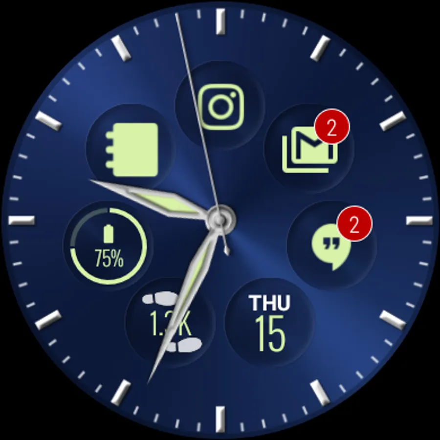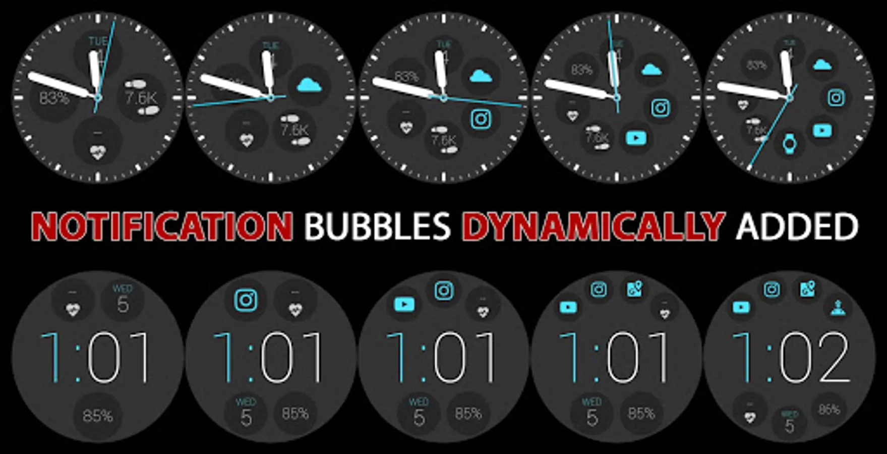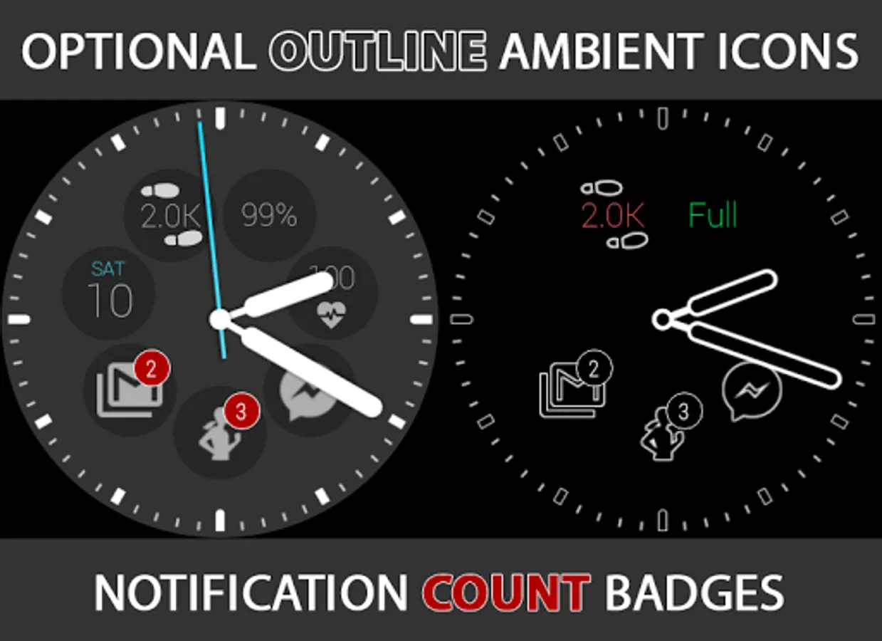 ► Dynamically adds notification icons to your watch face (up to 9 icons!)