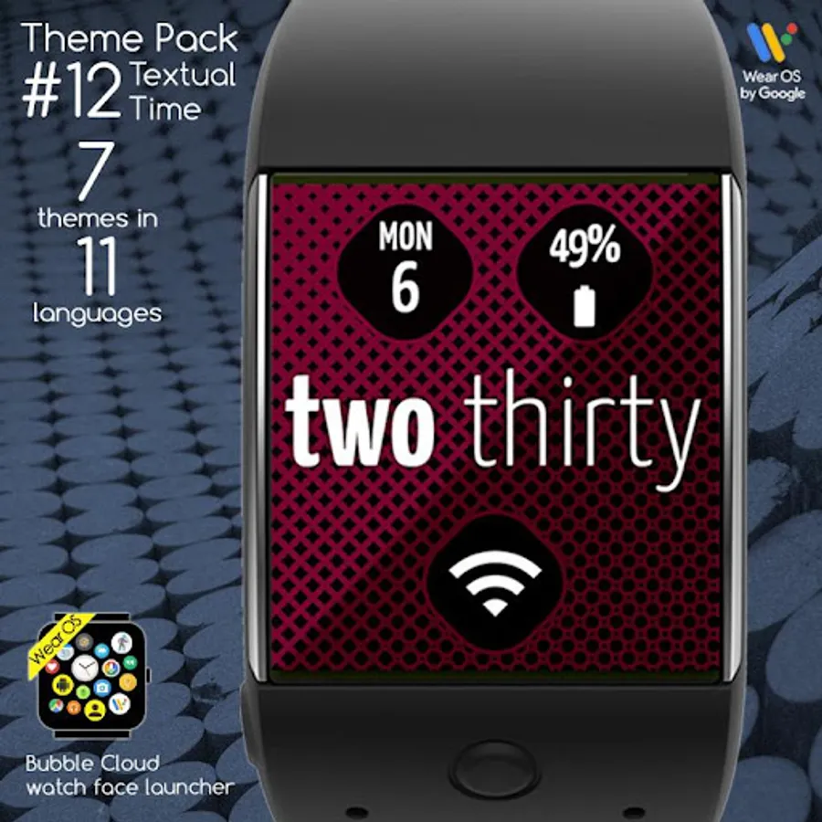This theme pack works with the Wear OS app Bubble Cloud Watch Face/Launcher (version 9.54 or higher). Please update main app to most recent version: https://play.google.com/store/apps/details?id=dyna.logix.bookmarkbubbles