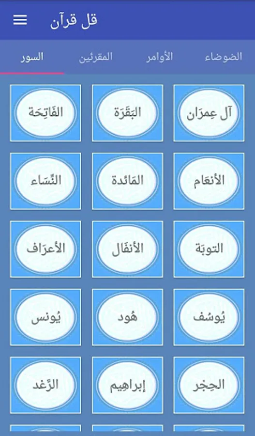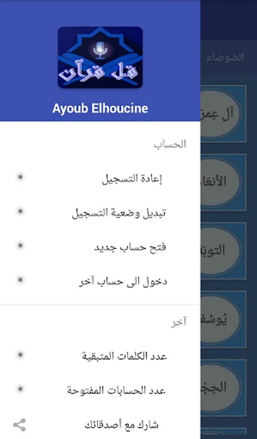 Log the names of the fence, reciters and control commands in this application; in order Nstamlhm programming reader in the phone Quranic unable to understand the vote and thus we control it without hands, and this is useful, for example, when driving a car or for those with special needs.