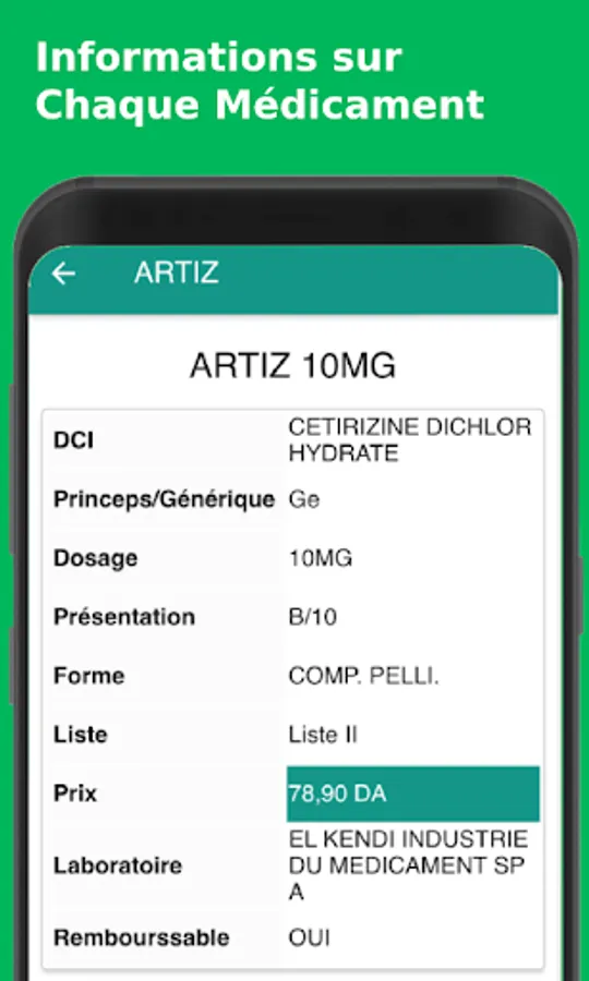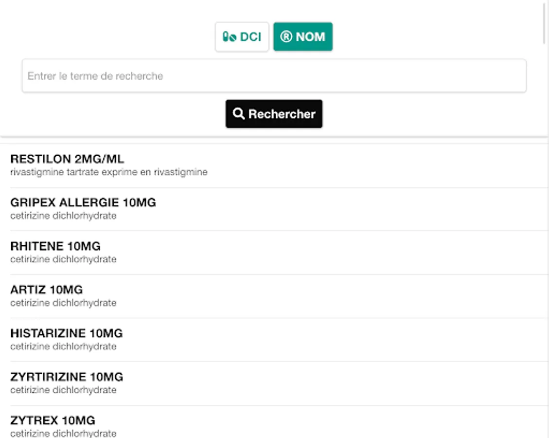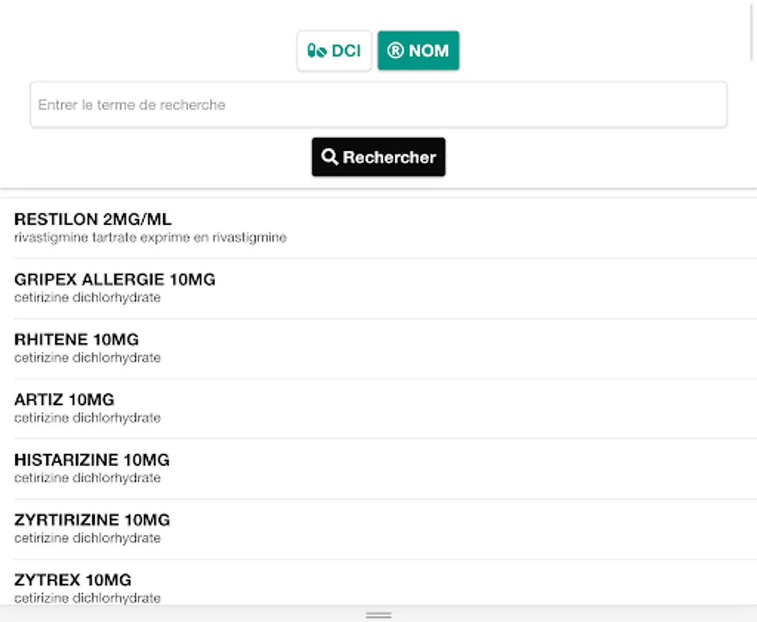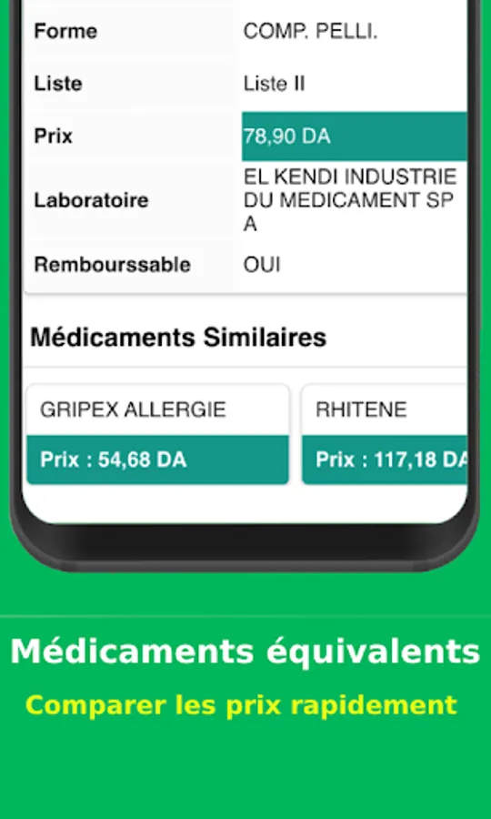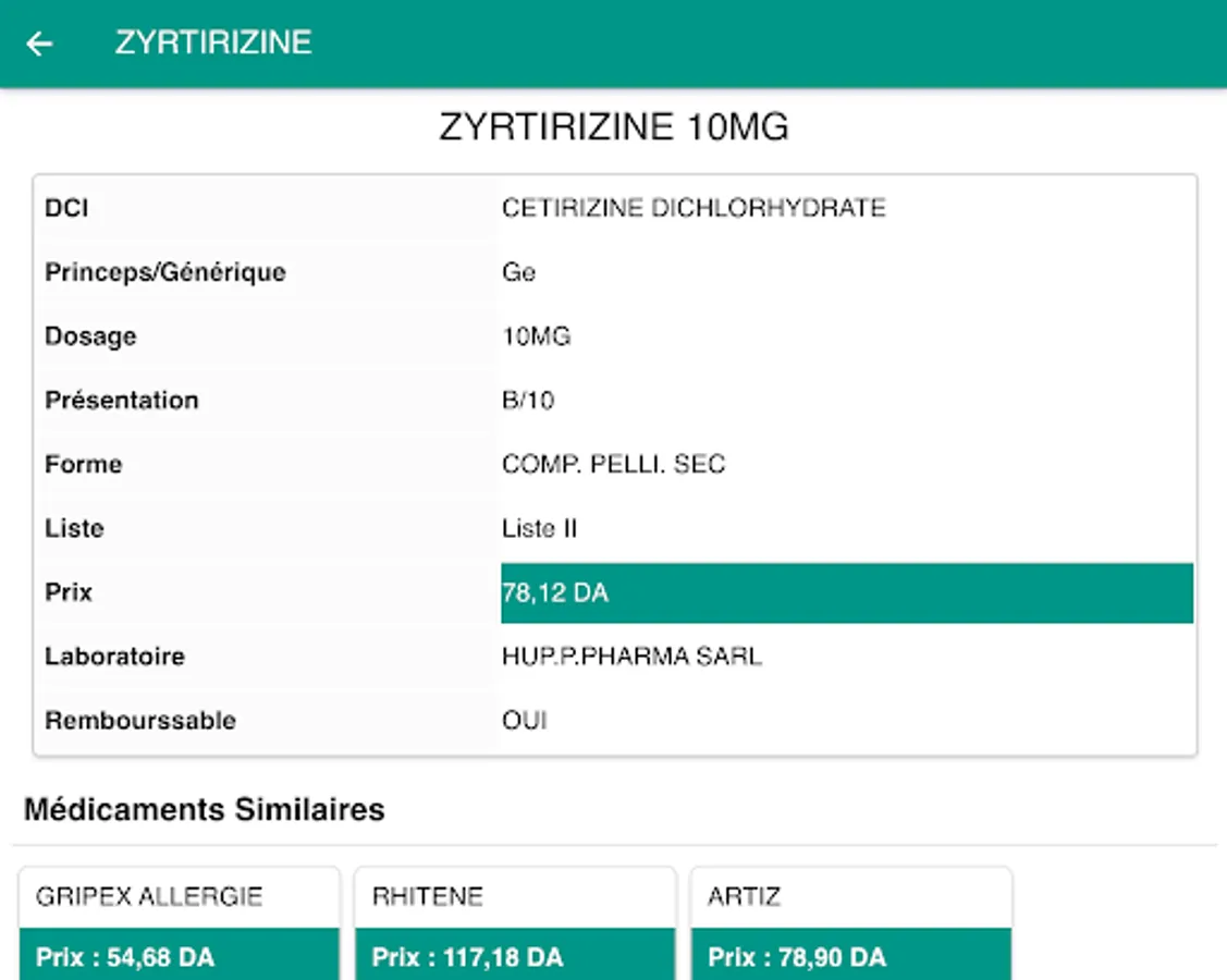 This application allows you to find drugs available in Algeria, view drug information by searching by brand name, active substance or by class, and list equivalent products.