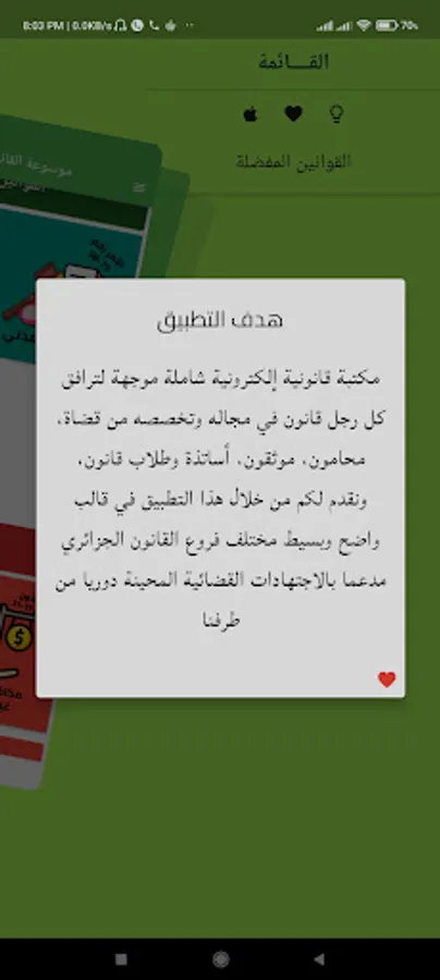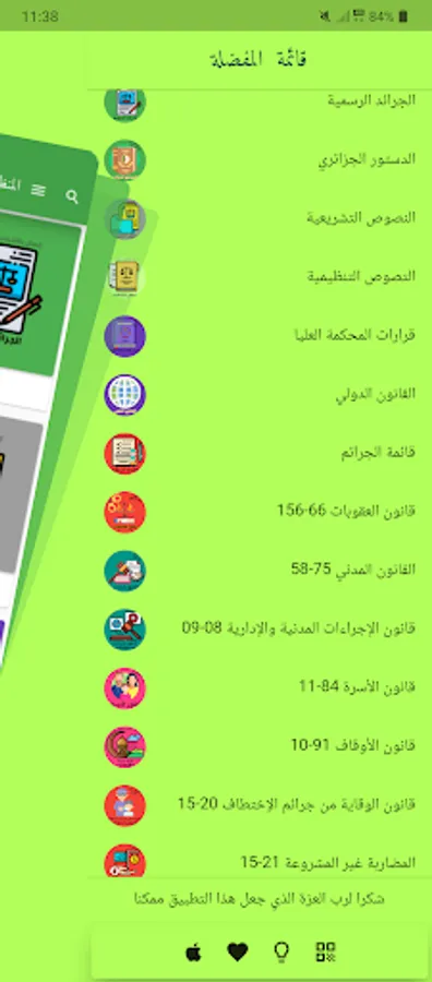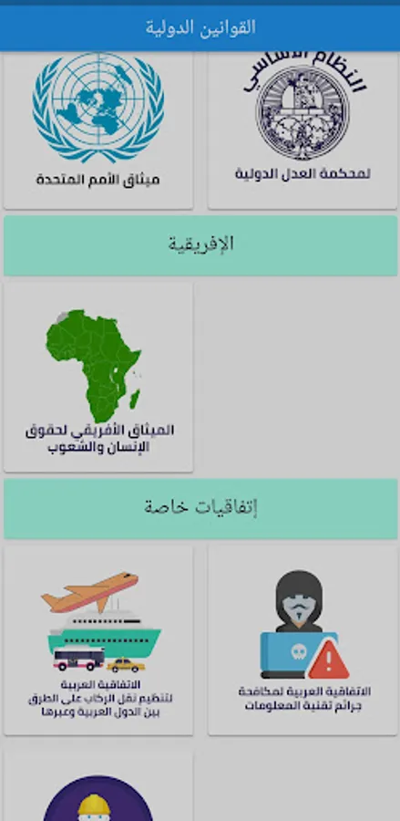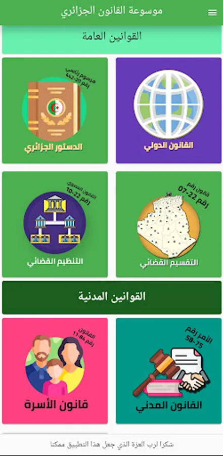 We present this application in a clear and simple template that covers the various branches of Algerian law, and supports them with jurisprudence periodically updated by us. The application contains Algerian laws with their latest amendment, and includes international laws such as charters, agreements, and others.