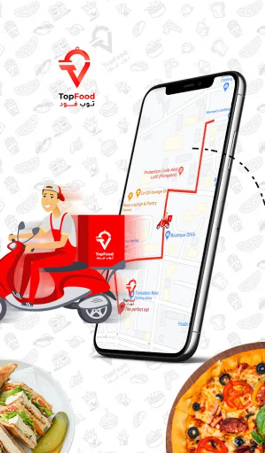 TOPFOOD is an innovative service to deliver all kinds of meals to its customers through an application that connects different kinds of restaurants, cafes and pastry shops. For that, the customer needs to have smart phone connected to the Internet so that he chooses the appropriate meal from the restaurant he wants, and then the delivery man will bring it to his home or workplace in a short time without trouble.