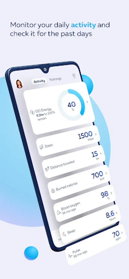 Daily Activity – Track, analyze & observe the most important health data – steps, distance traveled, burned calories, sleep and heart rate.