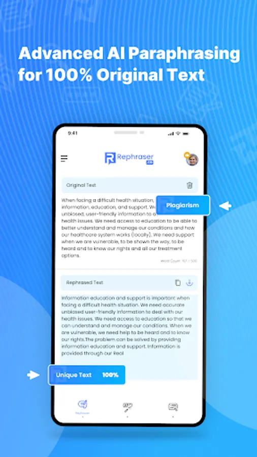 Paraphrasing or rewriting is not an easy task. Even an expert writer can end up having plagiarism in their paraphrased work. You don’t have to worry about plagiarism anymore once you try our paraphrase tool app. Our app is powered with AI algorithms and bots which are trained to create 100% plagiarism-free and fluent content.
