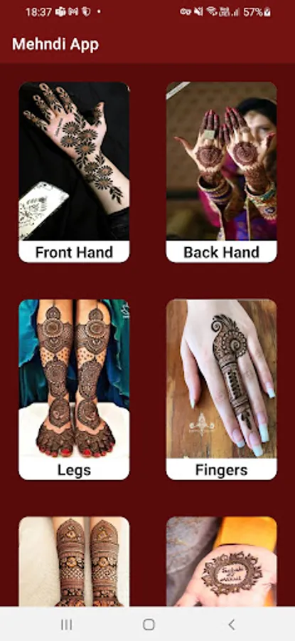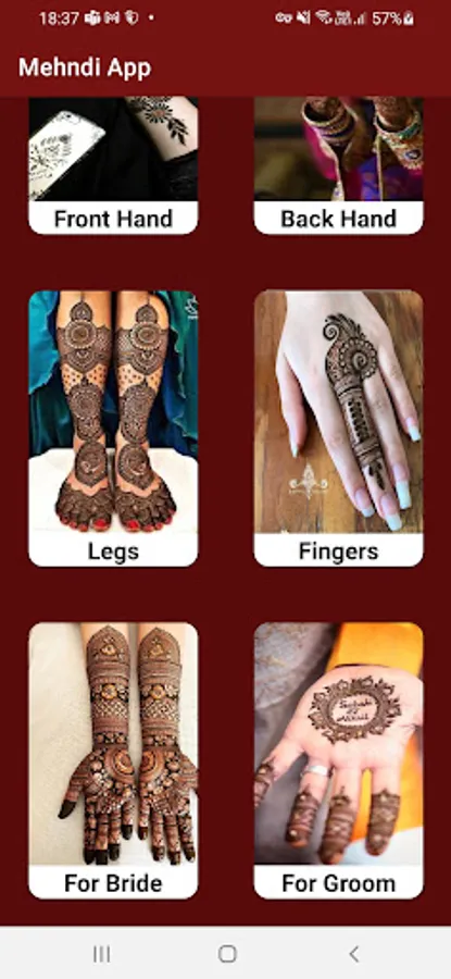 Different Categories for Mehndi like front hand, back hand, fingers and many more.
