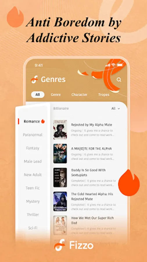As a book reading App, you'll find romance, mystery, action, adventure, fantasy, billionaire and more novel and book genres on Fizzo. Not only interesting novel and story genres, but also tons of amazing novels and books for you to read. Here, on Fizzo, you can read, download the novels, stories or books you like, add them to your novel library and even listen to the audio version of your favorite novels and books. Fizzo makes it possible for you to customize your novel library and the features on your novel reading app page to have a better novel reading experience in this reading app. Besides, you also can comment below novels you like and communicate with others about all your feelings!