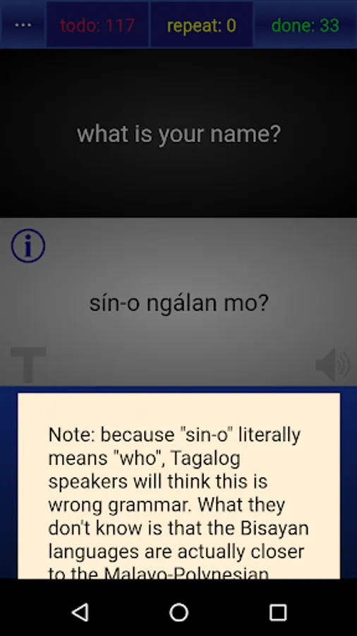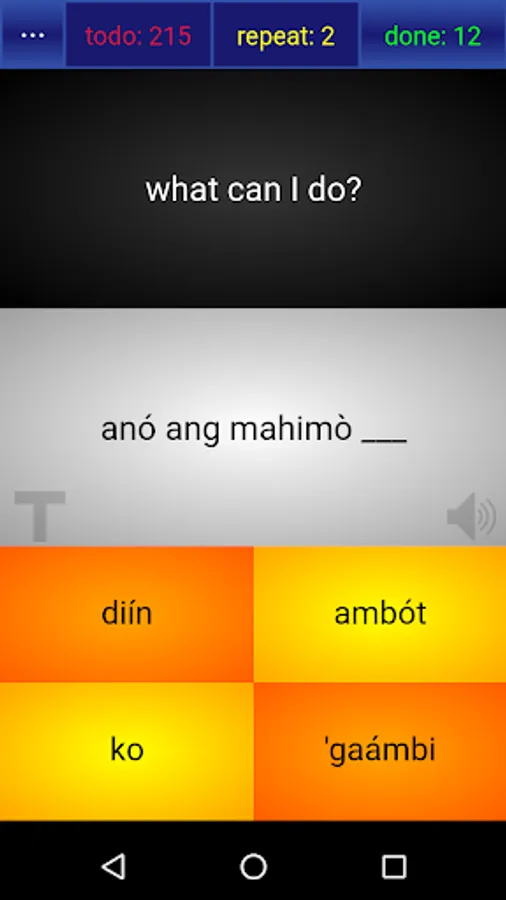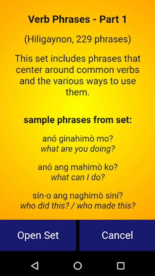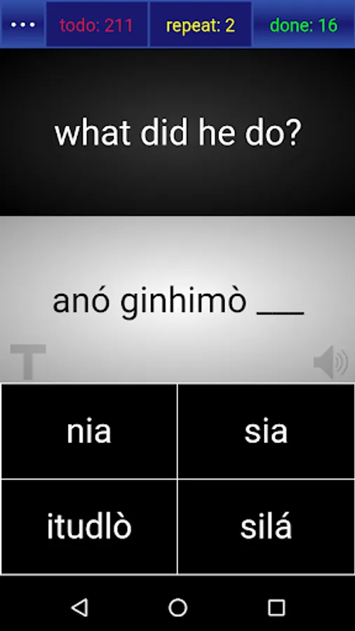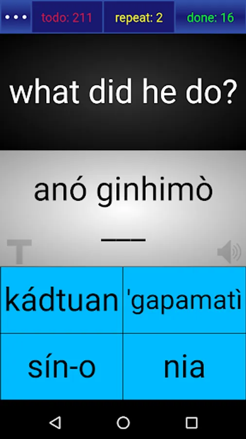 The app allows users to learn each sentence through trial and error. They are shown an English translation and tasked to build the corresponding Ilonggo phrase word by word. If they make a mistake, the phrase is automatically put in a "repeat" pile, and they will be given another chance sometime later to try again until they get it right.