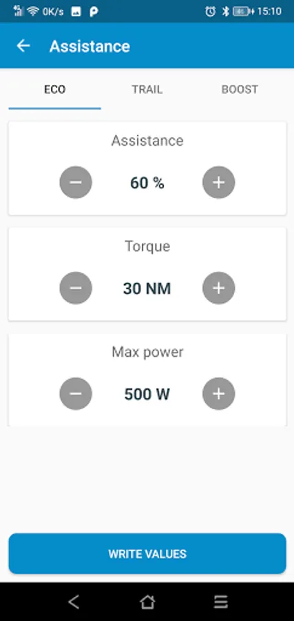 • Eco, Trail and Boost modes. Assist (%) , torque (NM) and power (W)