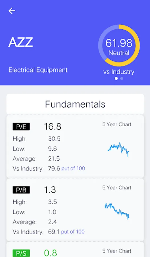 We analyze hundreds of fundamental indicators and many pieces of information of a stock and generate FA Scores for the stock and its relative strength in the overall market. Besides the score, you can also check the values and historical charts of several FA indicators like P/E, P/B, P/S, ROA, ROE, ROIC, D/E, Gross Margin, EBITDA Margin, Net Margin, etc. Know the good and the bad of the indicators.