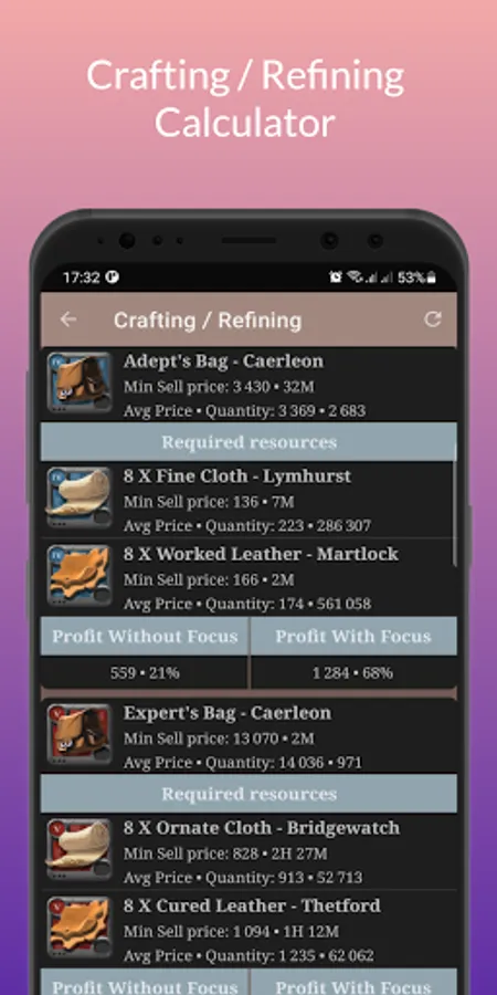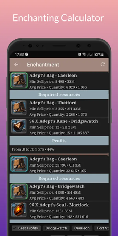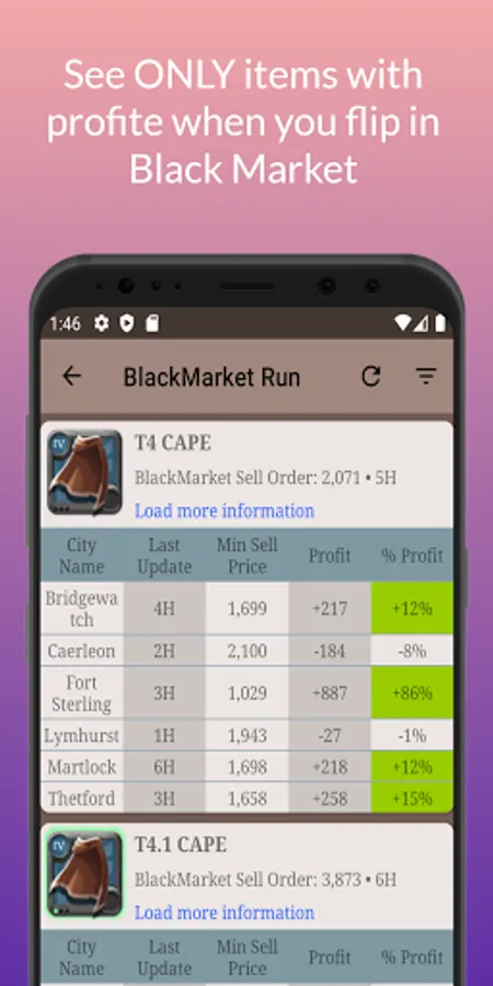 Display minimum sell prices of all items in all Royal Cities, & calculate the most profitable trade. (Buying the lowest selling price & Selling in the Royal city with the highest Selling price).
