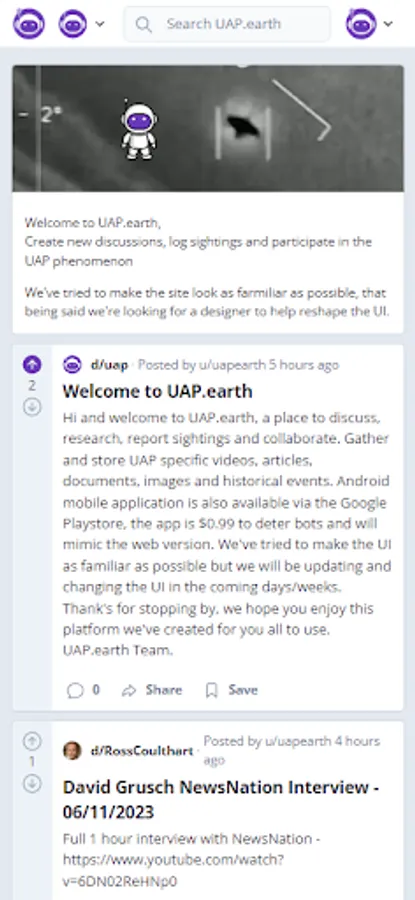 Browse through UAP.earth feed and view other users UFO and UAP sighting photo's and videos.