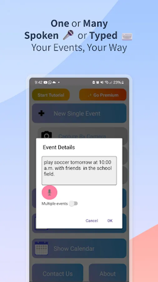 ✅ Voice-to-calendar: Create events simply by speaking. Using built-in speech recognition, the app listens to your voice input, converts it into text, and then extracts event details, making it easy to add reminders or appointments to your calendar on the go.