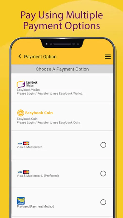 Payment can be made via our mobile app securely via all payment options such as Easybook eWallet, credit card, debit card and bank transfer from all major banks in South East Asia.
