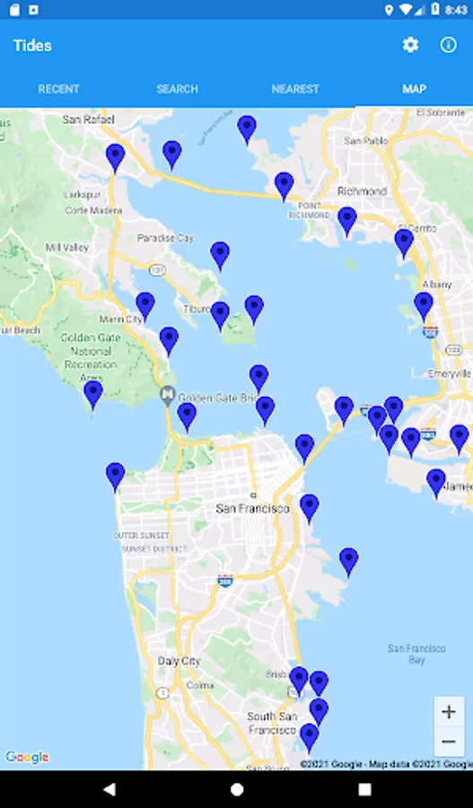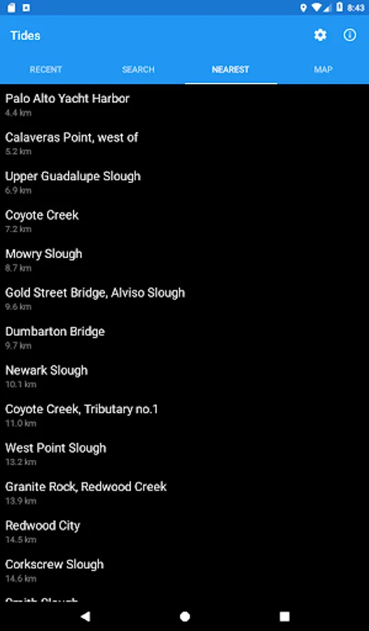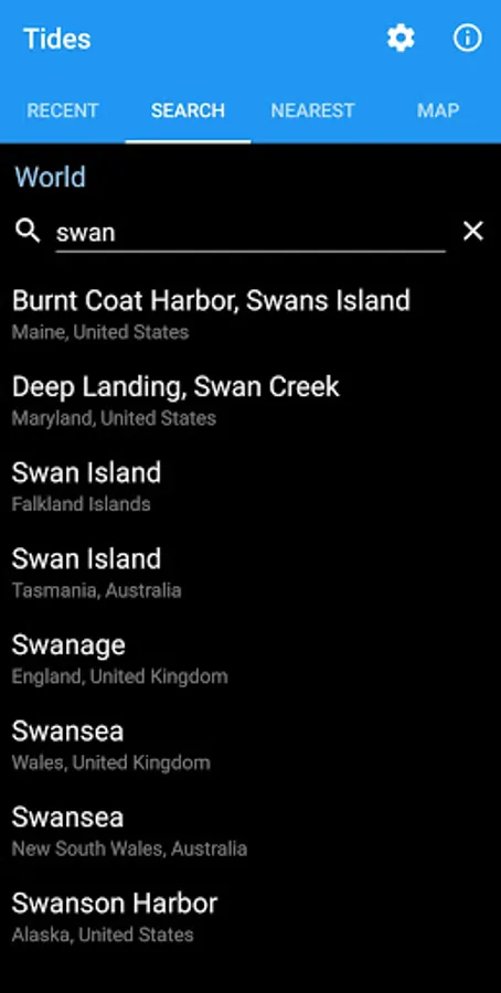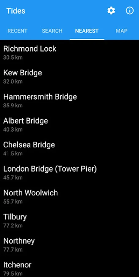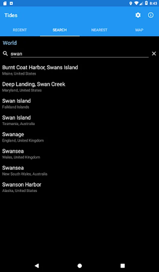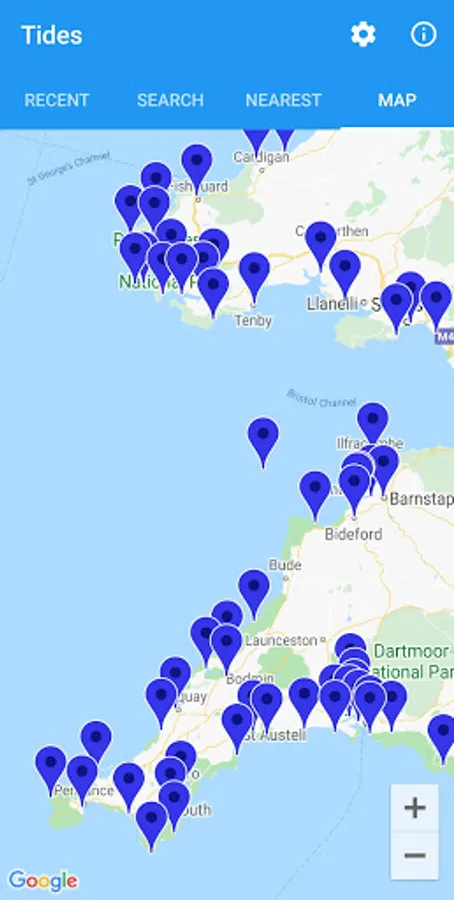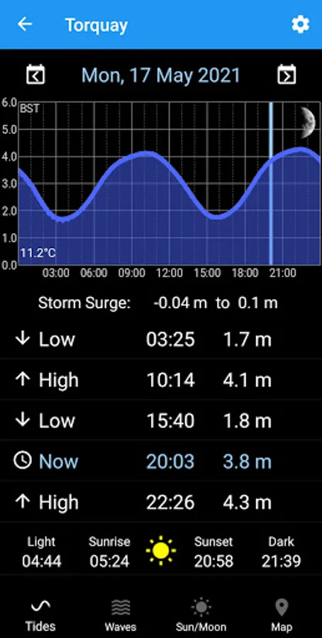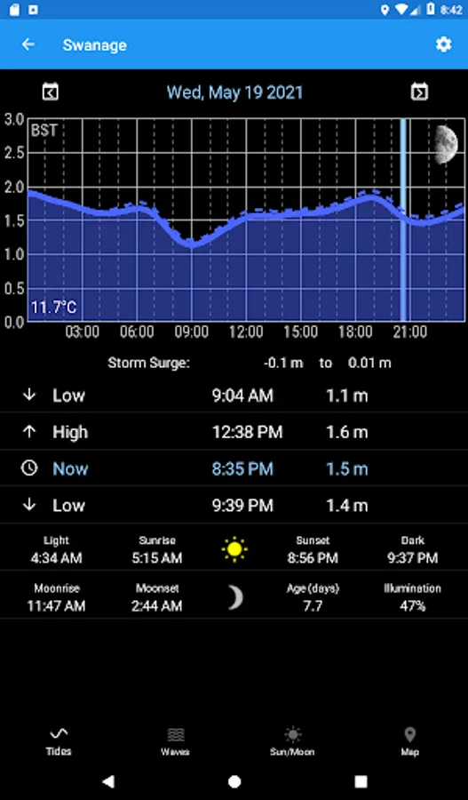 Tidal predictions for over 8500 locations showing high/low tide times, tide curve and current predicted tide height.