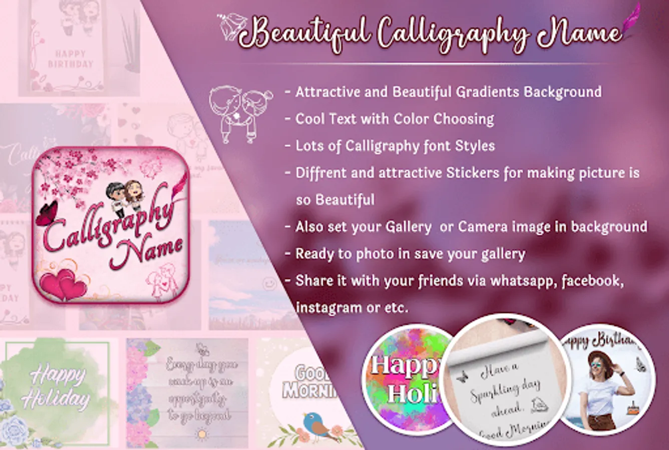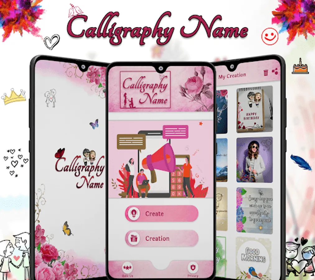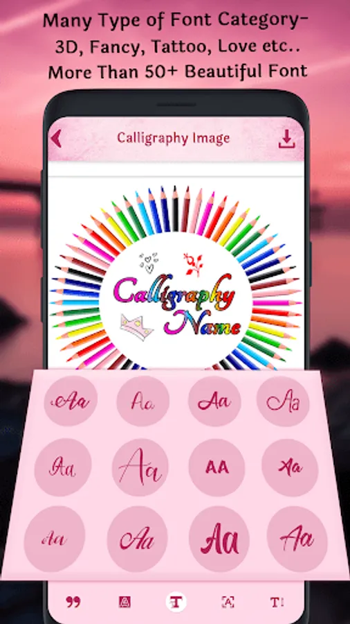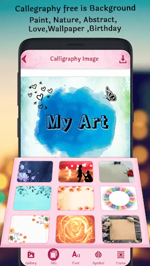 Write Calligraphy name using this application. Calligraphy Name app provides 500+ calligraphy font style to write your name on different background and gradients.