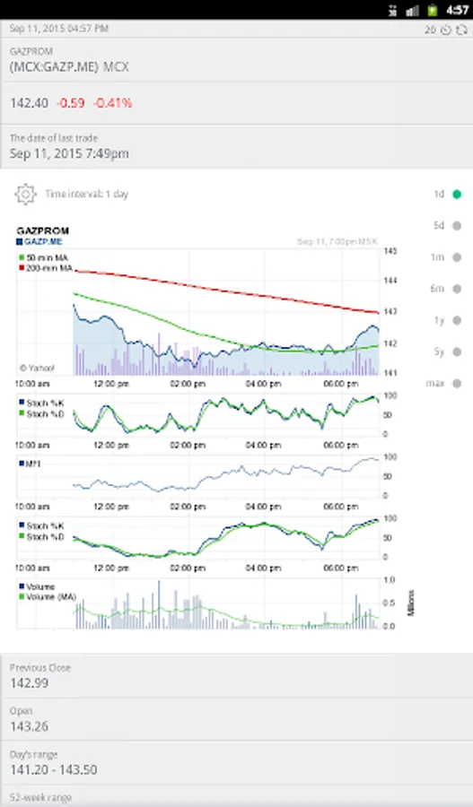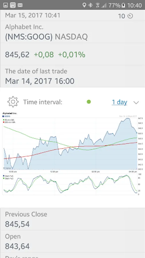 • viewing all the information about the stocks of the company, which includes indicators of the current value, volume, rising or falling prices percent, the lowest and highest point, averages and other important characteristics;