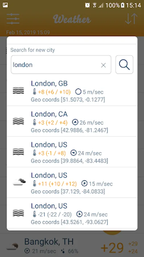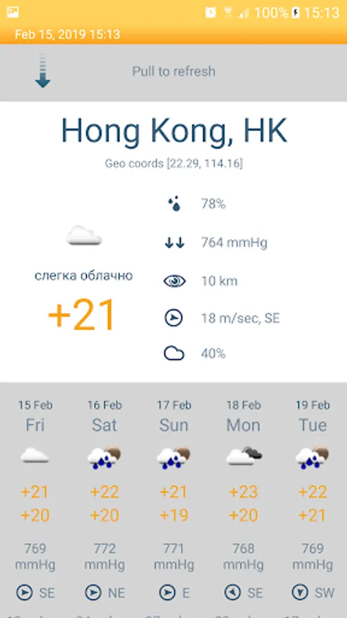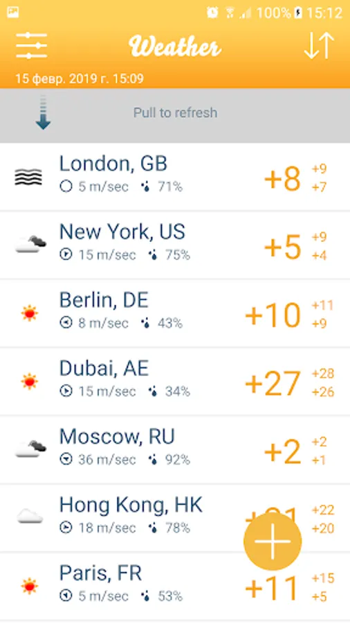 This application will be your great assistance; it will always inform you about the upcoming weather in your city and many others at any time. With an easy interface, you will always know the upcoming weather for the week (weather forecast). You can add an unlimited number of cities. The main window consists of a comfortable table in which you can view the daily weather forecast for all the selected cities, and if you want to view the weekly forecast - just click on the selected city. In this application you can view the temperature in Celsius or Fahrenheit. Also you can find out the speed of wind and its direction, humidity, pressure and other useful information. The application gets all the information from the Yahoo server and further this information is stored in a database on your device, so you can view the latest loaded weather forecast even without connecting to the Internet. In order to save your traffic only the very necessary data is being loaded (without pictures and other unnecessary information) that gives high speed of new data download. The application interface is very easy to use, the smallest possible number of buttons is marked, and to update the weather forecast you just need to move down the table.