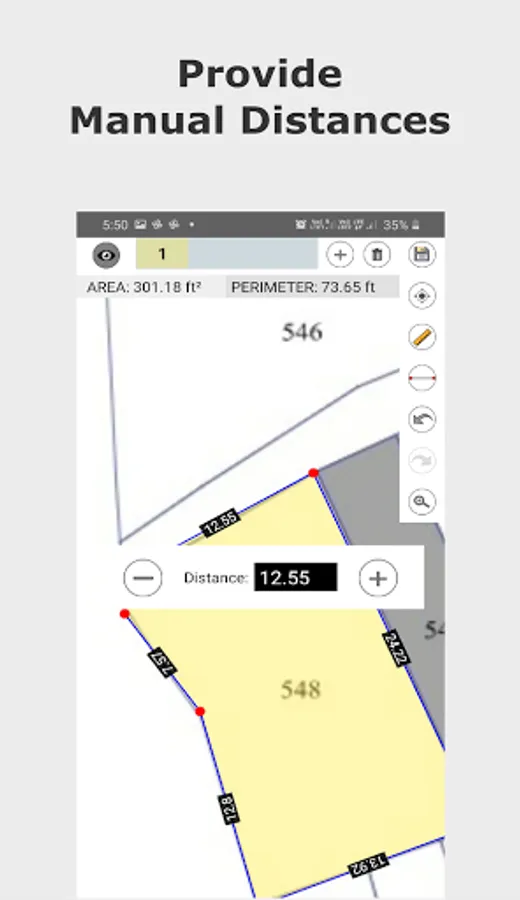 - Manual distances. You can input land border measurements manually. Tap on the distance label of any line to manually change the length of that line. Currently available only while measuring on photos.