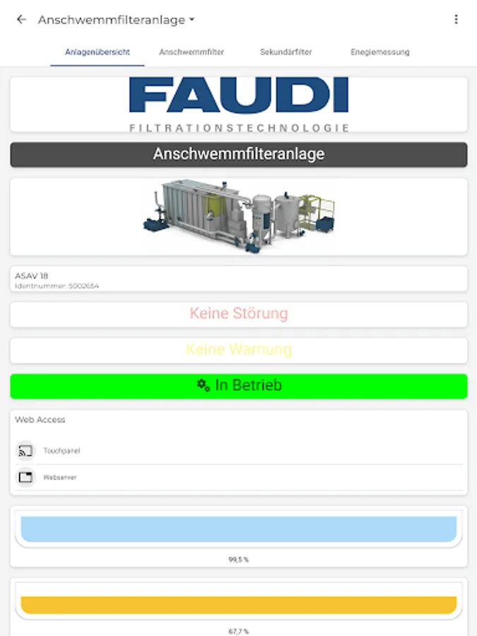 With the EasyControl app, you have your FAUDI system under control at all times. The dashboards of the IIOT platform give you the most important information about the current status of your FAUDI system at a glance. The visualization of the data and notification of critical system states create transparency and responsiveness. Minimize downtimes with the help of the EasyControl app and operate the system remotely.