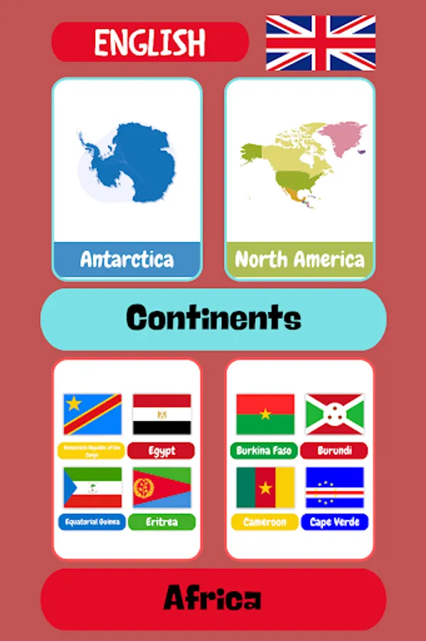 Explore the diverse continents of our world through captivating flashcards. From the vast plains of Africa to the bustling cities of Asia, the picturesque landscapes of Europe, the breathtaking islands of Oceania, the iconic landmarks of North America, the vibrant cultures of South America, and the frozen wonderland of Antarctica, each continent is beautifully represented, allowing users to develop a global perspective while learning English.
