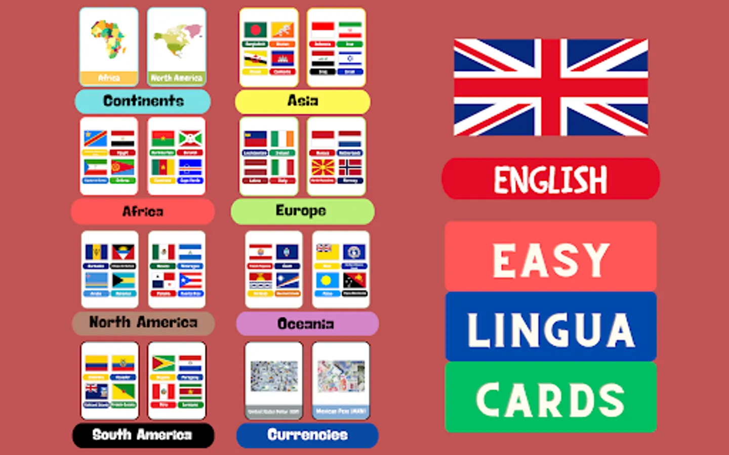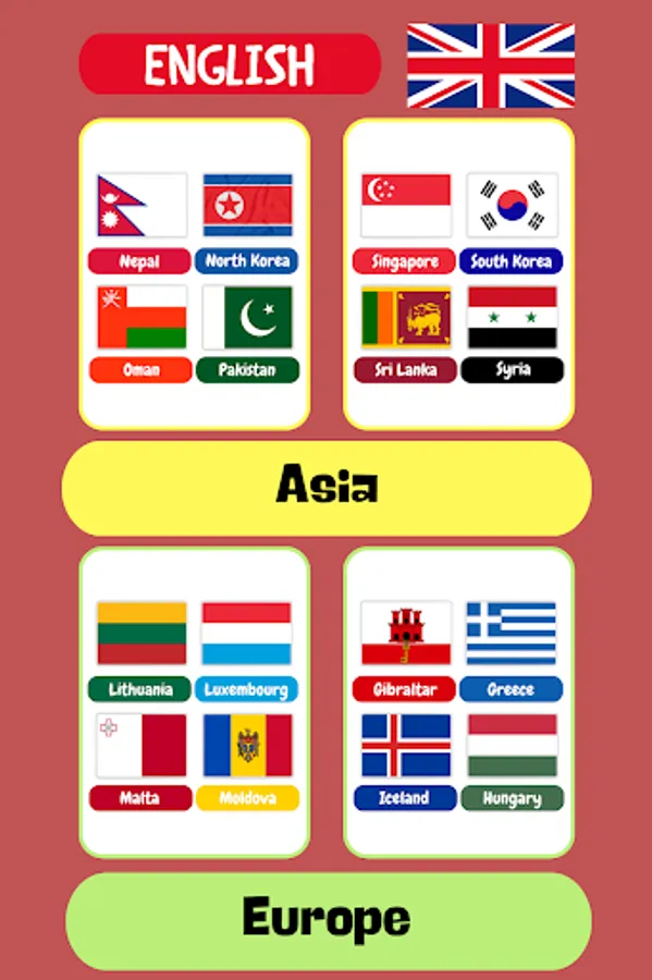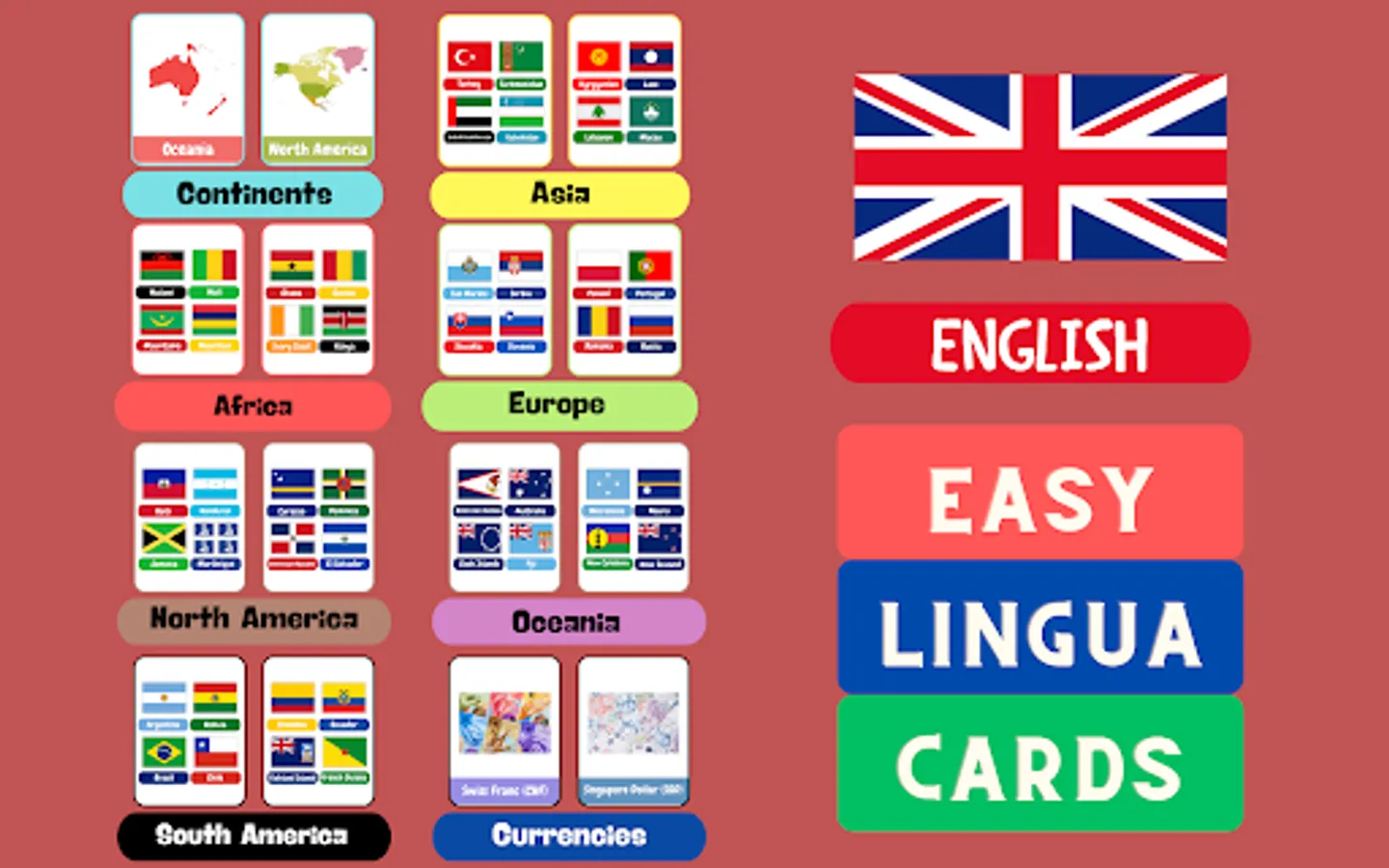 Introducing "Countries Flashcards: Learn English" - an interactive and engaging app designed to help users learn English by exploring the world. Whether you're a child eager to learn your mother tongue or a foreigner looking to master a new language, this app provides an enjoyable and educational experience. With a wide range of flashcards featuring continents, country flags, and currencies, "Countries Flashcards" offers a dynamic learning tool that facilitates language acquisition and cultural understanding.