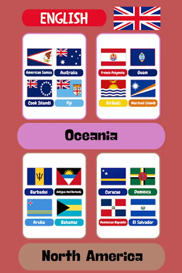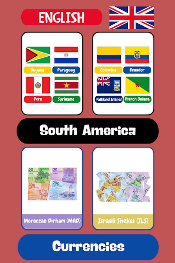 "Countries Flashcards: Learn English" is a valuable companion on your language learning journey. Embark on an exciting adventure across continents, explore country flags, and familiarize yourself with different currencies - all while expanding your English language skills. With its engaging visuals and user-friendly interface, the app provides an interactive and educational platform that makes learning English an enjoyable experience for learners of all ages and backgrounds.
