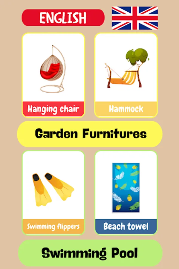 For those interested in outdoor relaxation, the Garden Furniture category presents a variety of seating options such as benches, chairs, and hammocks, as well as other essentials like garden tables and barbecues. The Swimming Pool category takes users into the world of aquatic recreation, featuring vocabulary related to swimming pools, pool accessories, and even inflatable toys.