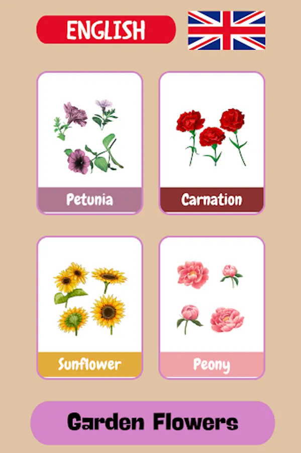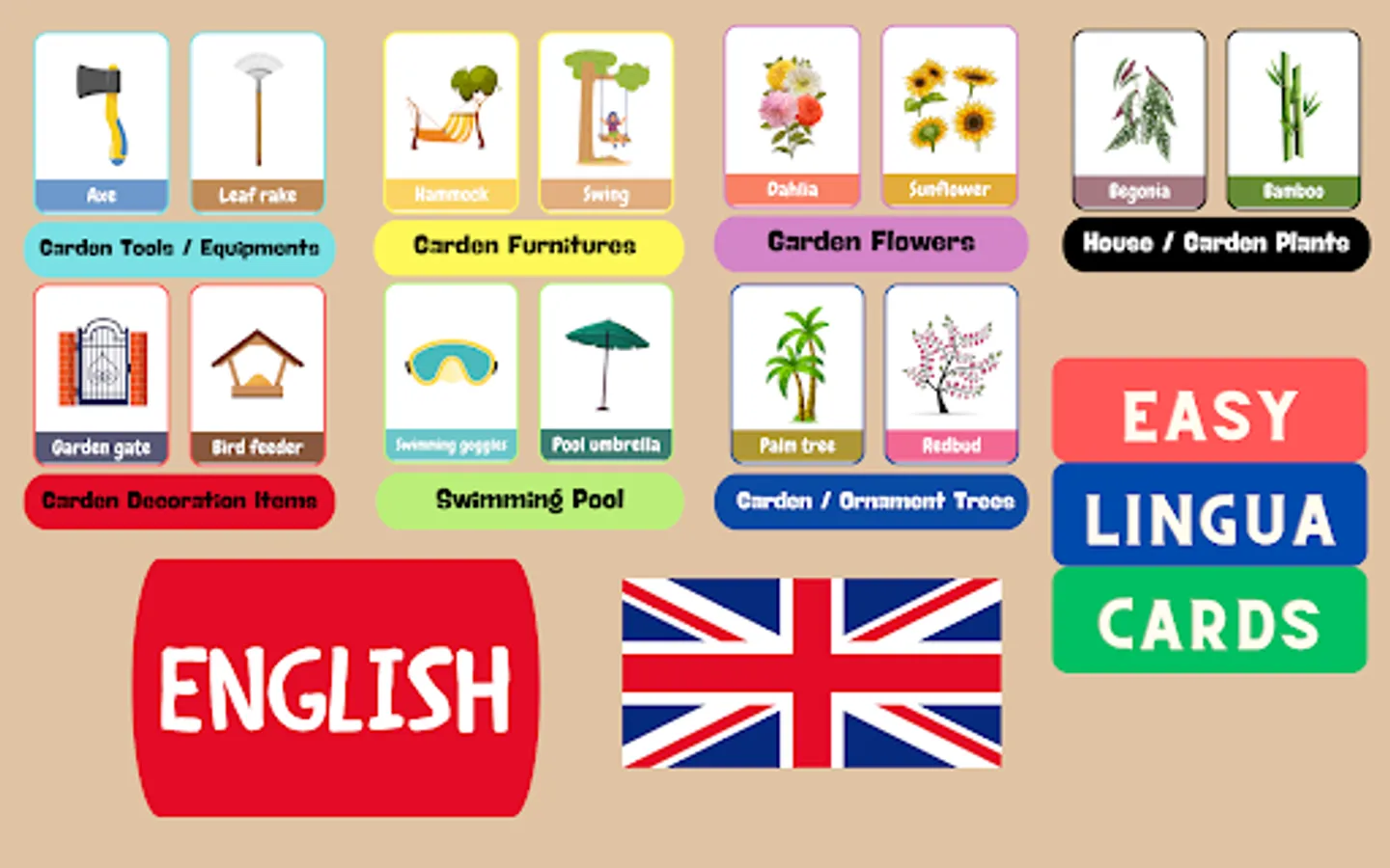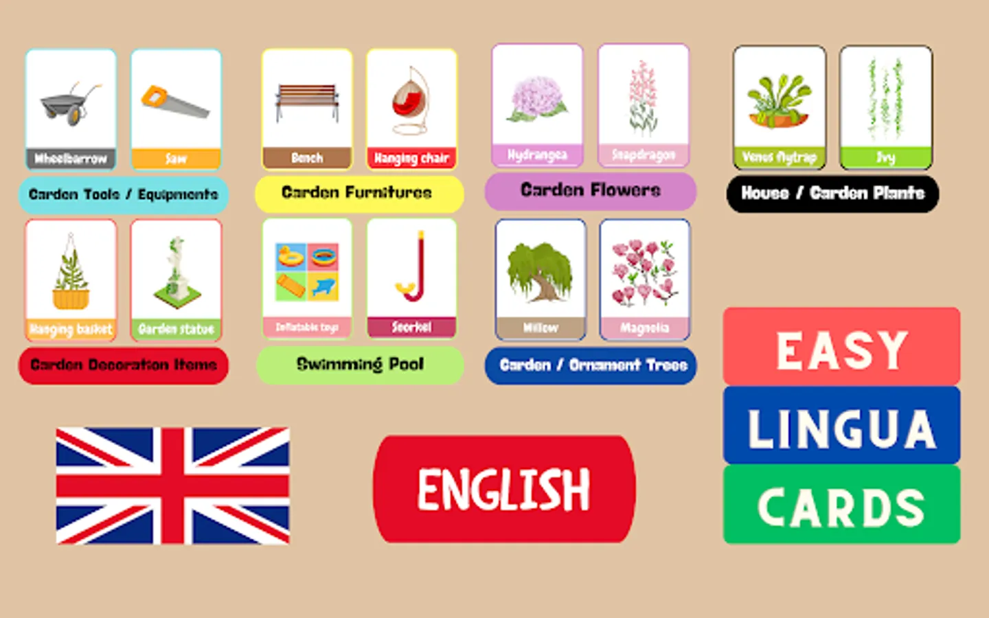 The Garden Flashcards app offers a user-friendly and intuitive interface, making it easy to navigate and explore various categories of garden-related topics. Each flashcard features a vibrant image depicting a specific item or concept, accompanied by its corresponding English word. Users can simply swipe through the flashcards to discover and learn new vocabulary words related to gardens.