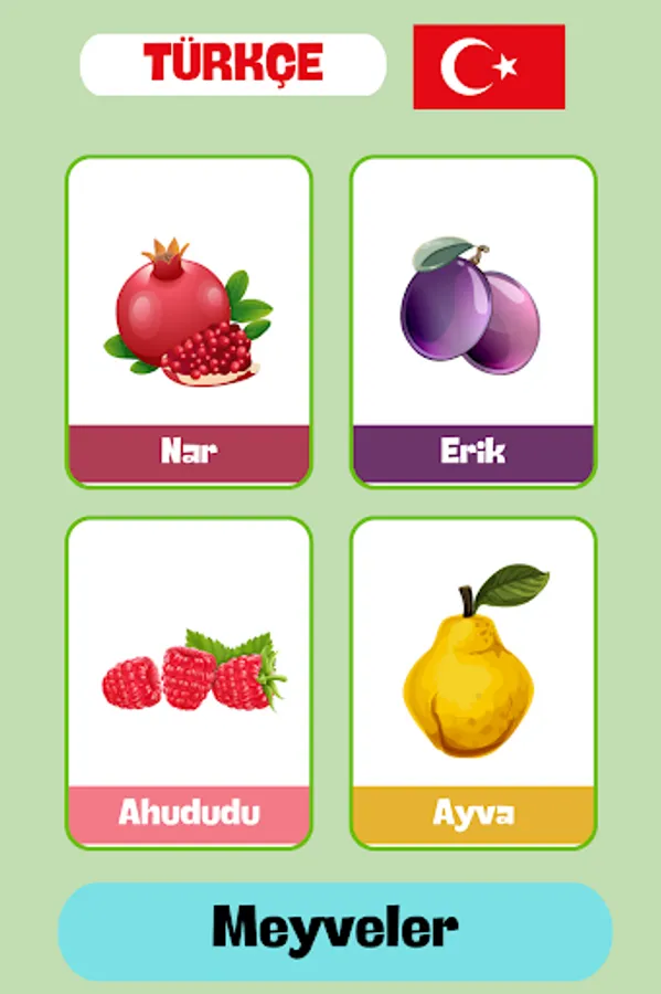 Meyve kategorisi, farklı meyve türlerini içeren üç ayrı bölümden oluşur. Her bölümde, ünlü Türkçe meyvelerden başlayarak daha az yaygın olanlara doğru ilerleyen bir sıralama bulunur. Bu kartlar, kullanıcıların meyveleri adlandırmalarını, tanımalarını ve hatta meyve isimlerini Türkçe olarak telaffuz etmeyi öğrenmelerini sağlar. Elma, kayısı, avokado, muz, böğürtlen, yaban mersini gibi bilindik meyvelerden, ejder meyvesi, kızılcık, mürver gibi daha az bilinenlere kadar geniş bir yelpaze sunar.