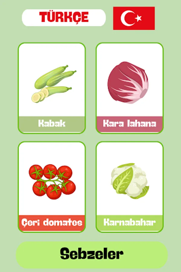 Sebze kategorisi, sağlıklı beslenme ve Türk mutfağına özgü yemeklerin temel malzemeleri olan çeşitli sebzeleri içerir. Kullanıcılar, enginar, kuşkonmaz, biber, pancar, domates, patlıcan, havuç gibi sebzelerin adlarını öğrenirken aynı zamanda bu sebzelerin nasıl göründüğünü de görsel olarak keşfederler. Bu bilgi kartları, Türk mutfağına ilgi duyan kullanıcıların yemek tariflerini anlamalarına ve yerel pazarlarda alışveriş yaparken sebzeleri tanımalarına yardımcı olur.