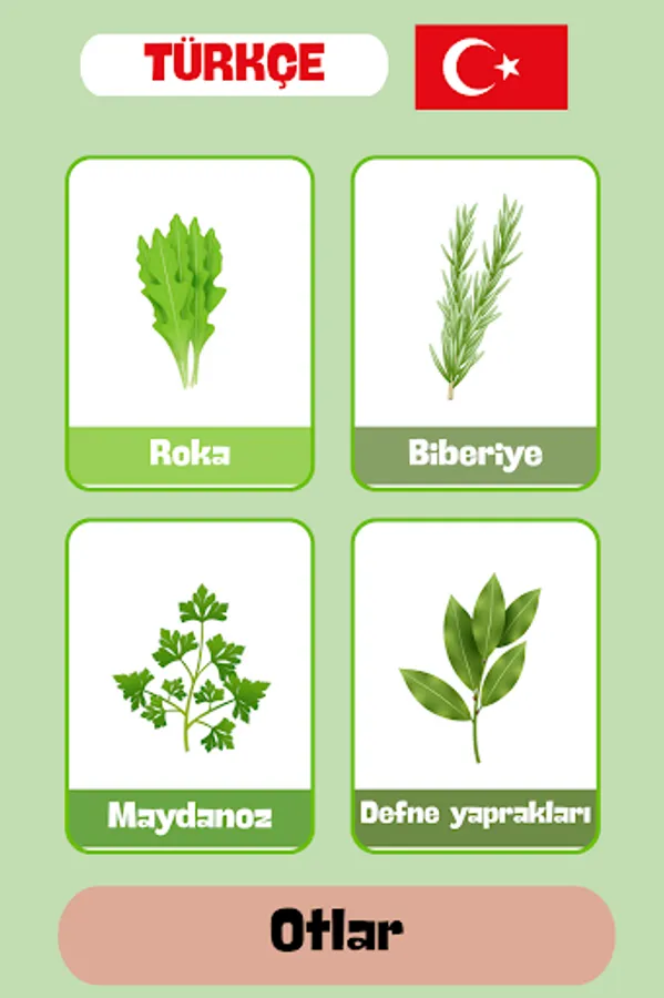 Otlar kategorisi, Türk mutfağının önemli bir parçası olan ve lezzetlendirici, aromatik bitkileri içerir. Bu kartlar, kullanıcıların Türkçe olarak maydanoz, kekik, biberiye, nane, lavanta, roka gibi çeşitli otların isimlerini öğrenmelerine yardımcı olur. Ayrıca, bu bitkilerin kullanım alanları ve Türk mutfağındaki yerlerini keşfetme fırsatı sunar. Örneğin, reyhan, Türk mutfağında yaygın olarak kullanılan bir ot olup, birçok yemeğe karakteristik bir tat ve koku katmaktadır. Bu uygulama sayesinde kullanıcılar, Türk yemek kültürünü daha iyi anlayabilir ve yerel tatları keşfedebilirler.