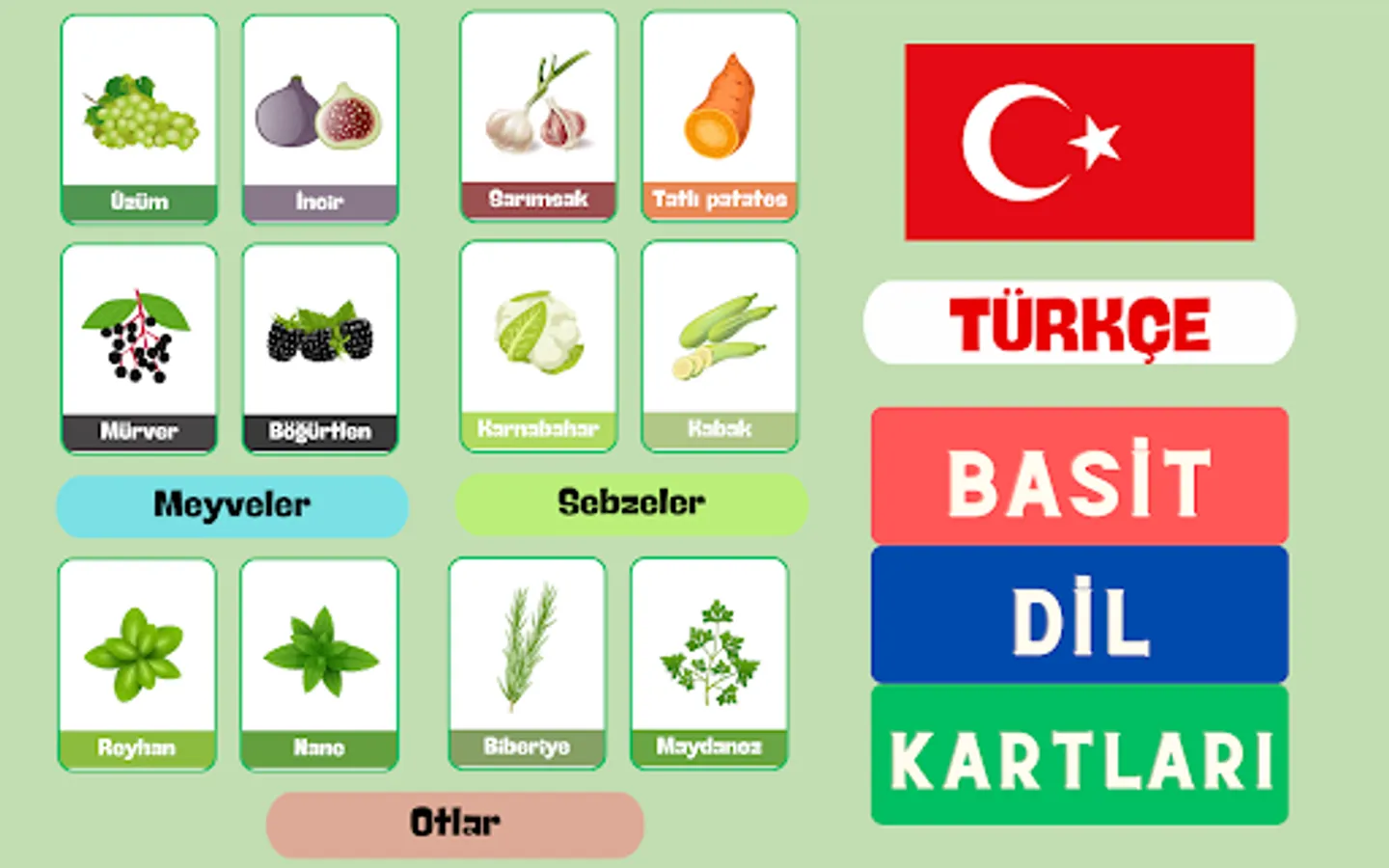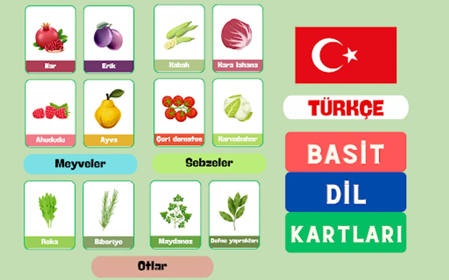 Uygulama, kullanıcıların Türkçe'deki meyve, sebze ve otları keşfetmelerine yardımcı olmak için kategorilere ayrılmış bir dizi bilgi kartı sunar. Kullanıcılar, her kelime kartını görüntüleyerek ve üzerindeki görseli inceleyerek yeni kelimeler öğrenebilirler. Görseller, meyve, sebze ve otların gerçekçi ve renkli resimlerini içerir, böylece kullanıcılar doğru şekilde tanımalarını ve hatırlamalarını sağlar.