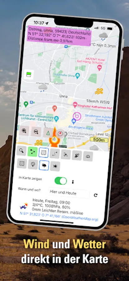 Sunshine, rain or gusts of wind - with easyROUTES X you always have an overview of the current weather worldwide. Are you only leaving tomorrow, but would like to know today what you can expect meteorologically in the coming days? No problem thanks to the five-day preview. The course of the sun and the moon can also be easily faded in and out.